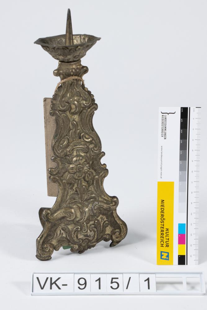 Zierbeschlag aus Messingblech mit einer Kerzenhalterung.