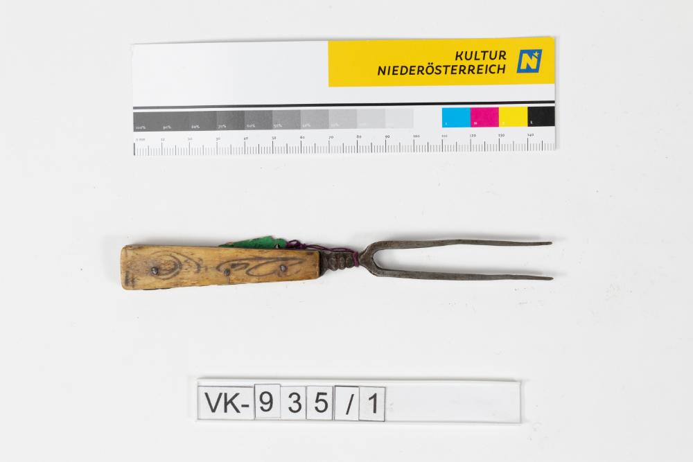 Zweizinkige Gabel mit kantigem, zum Ende hin verbreiterten Griff mit verzierten Hornschalen.