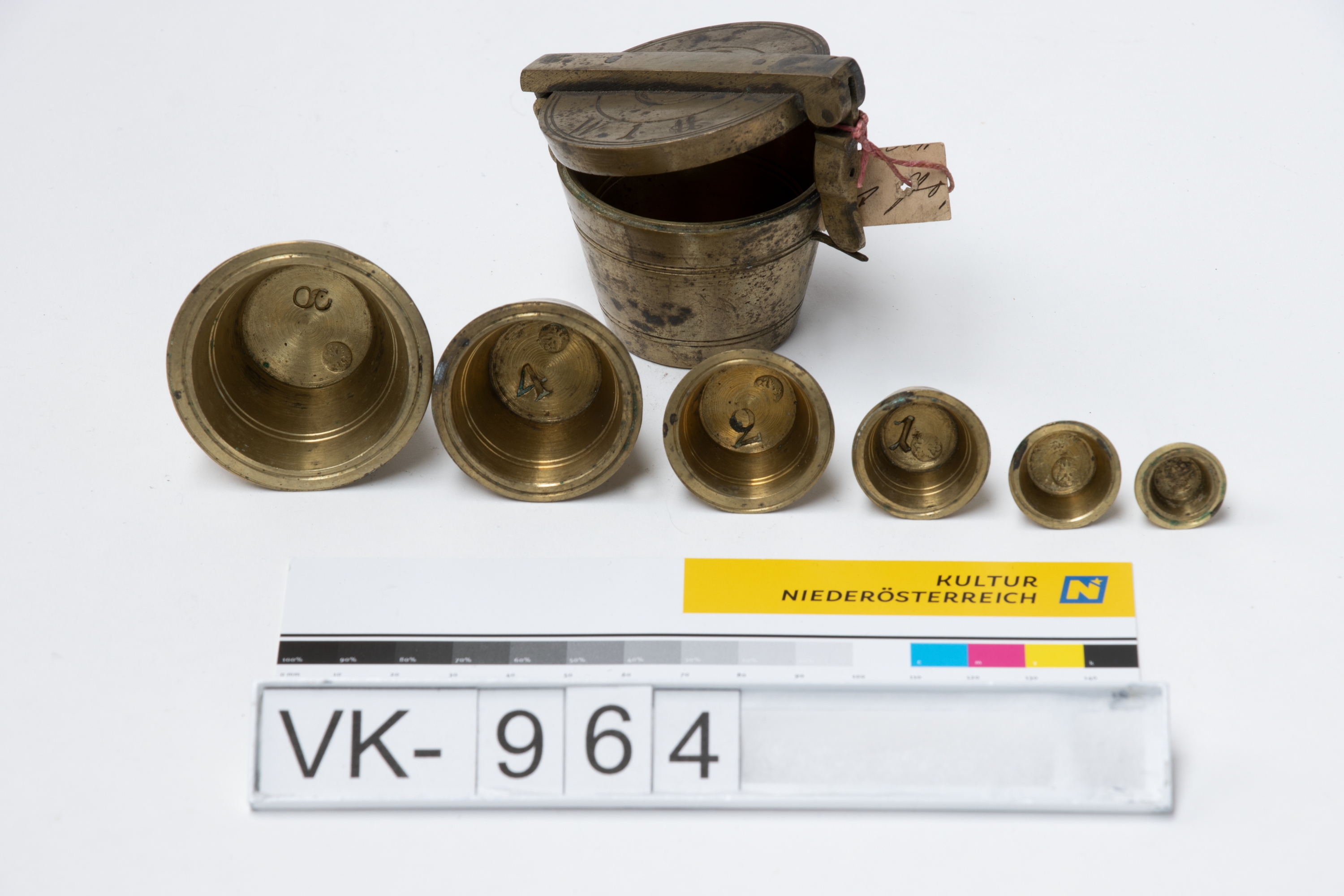 Ein Satz Bechergewichte aus Messing mit einem Aufbewahrungsgewicht mit Klappdeckel (VK-964a) und sechs ineinander gestapelten kleineren Gewichten (VK-964b bis VK-964g, von groß nach klein). Die Gewichte sind mit unterschiedlichen Punzierungen (Doppeladler, Zahlen, Buchstaben) versehen.
