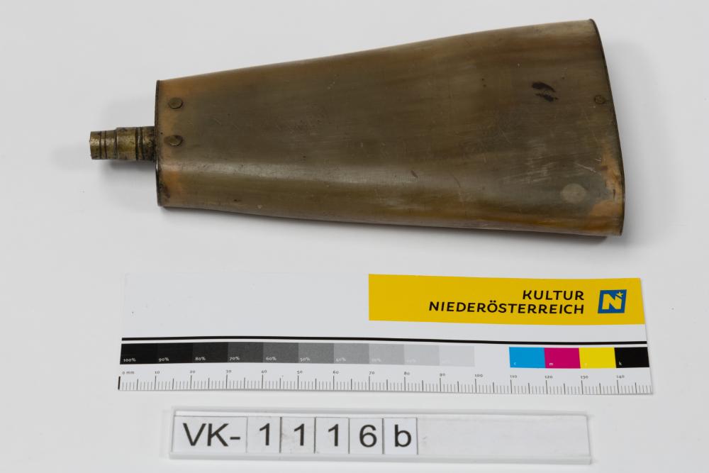Annähernd dreieckige Pulverflasche aus Horn mit Messingboden und Messingdeckel mit einem kurzen Hals.
