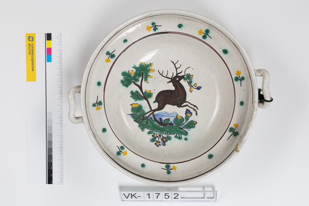 Weiß glasierte Schüssel mit zwei Henkeln und mehrfärbiger Bemalung: Umlaufend kleine Blümchen auf der Fahne, ein springender Hirsch mit Vegetation auf dem Spiegel.
