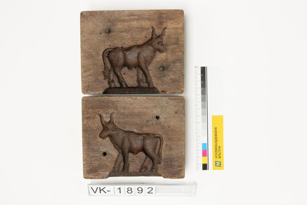 Zwei Hälften eines Lebzeltermodels mit Führungen und jeweils einem eingeschnitzten Motiv: Ein Rind.
