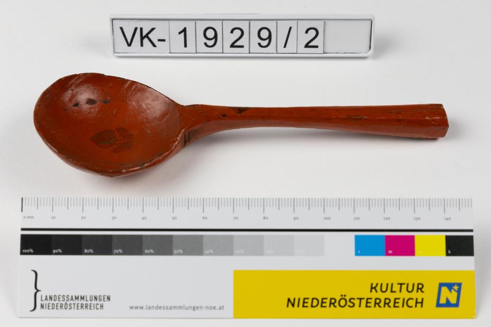 Orange lackierter Holzlöffel mit runder Laffe und annähernd rundem Stiel.