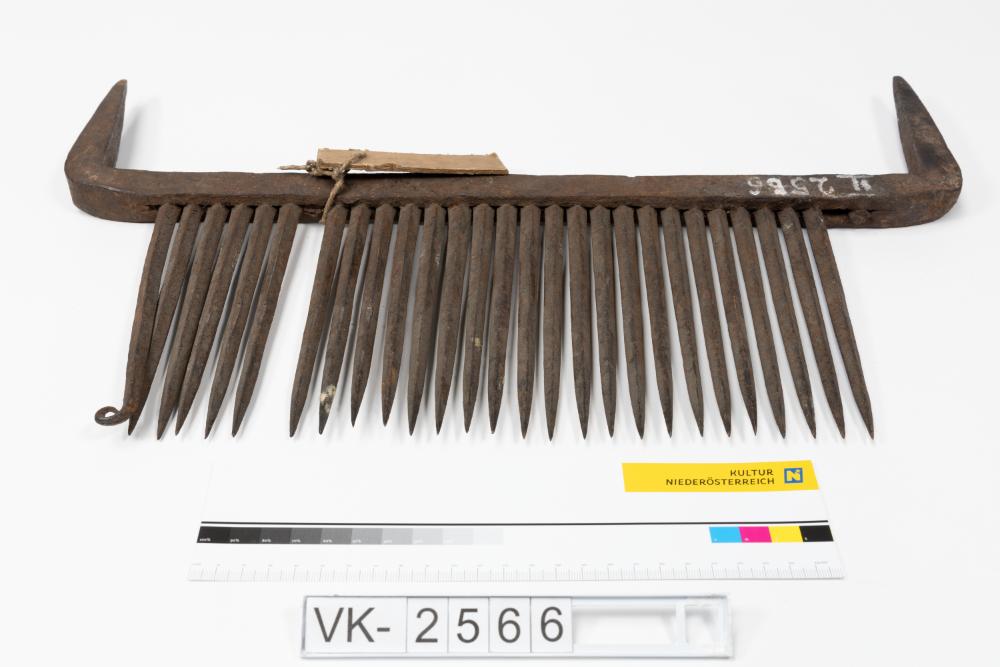Hechel: Schmiedeeisernes kammähnliches Gerät auf einem Träger mit zwei Einschlagspitzen.