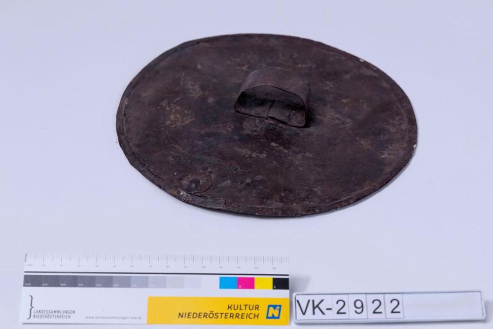 Runder flacher Metalldeckel mit einem Bandhenkel.