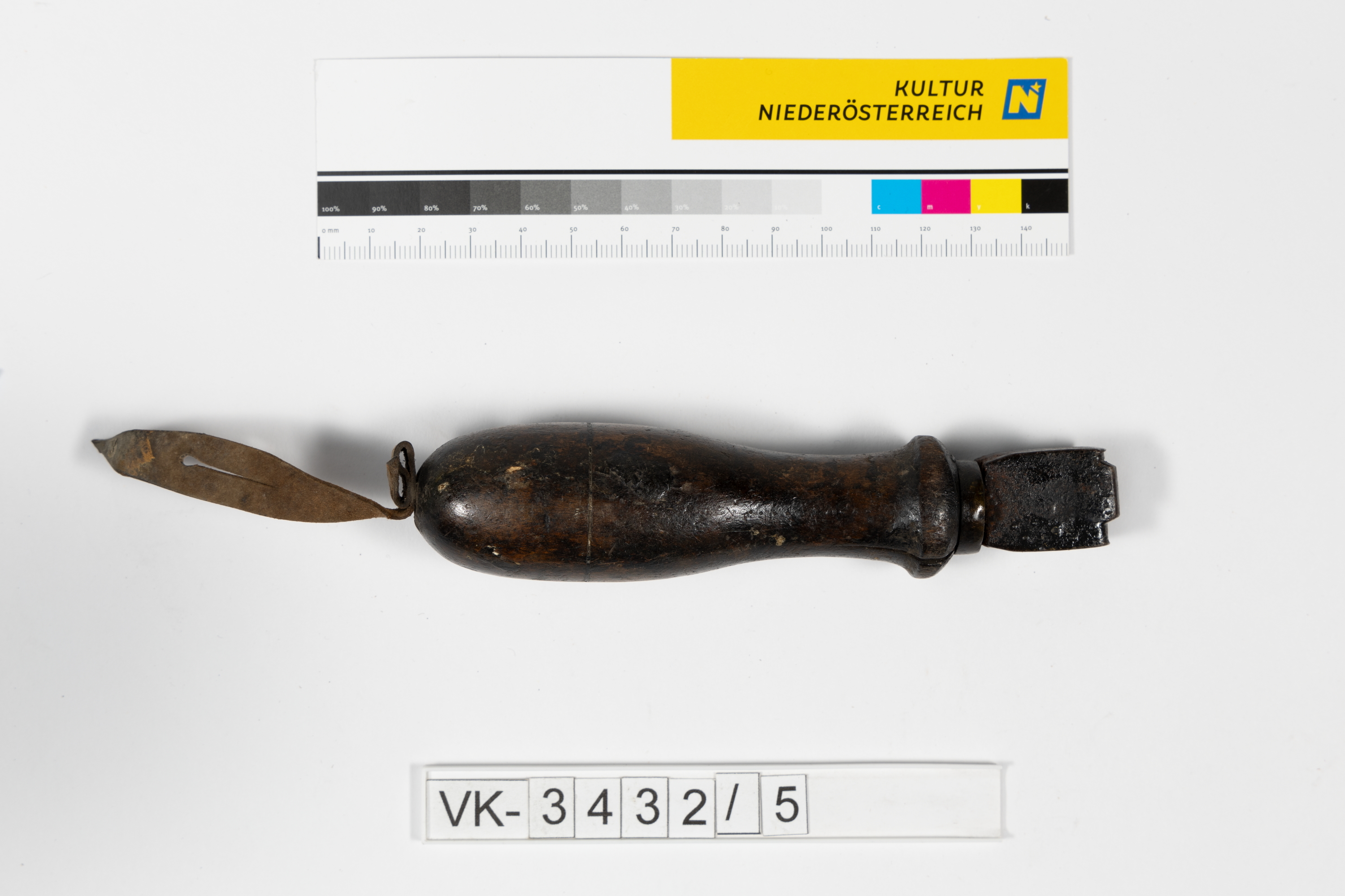 Annähernd trapezförmiges Schnitteisen mit einem gedrechselten Holzgriff, der mit einem Metallring verstärkt ist. Am Ende des Griffs ist eine Lederschlaufe angenagelt.