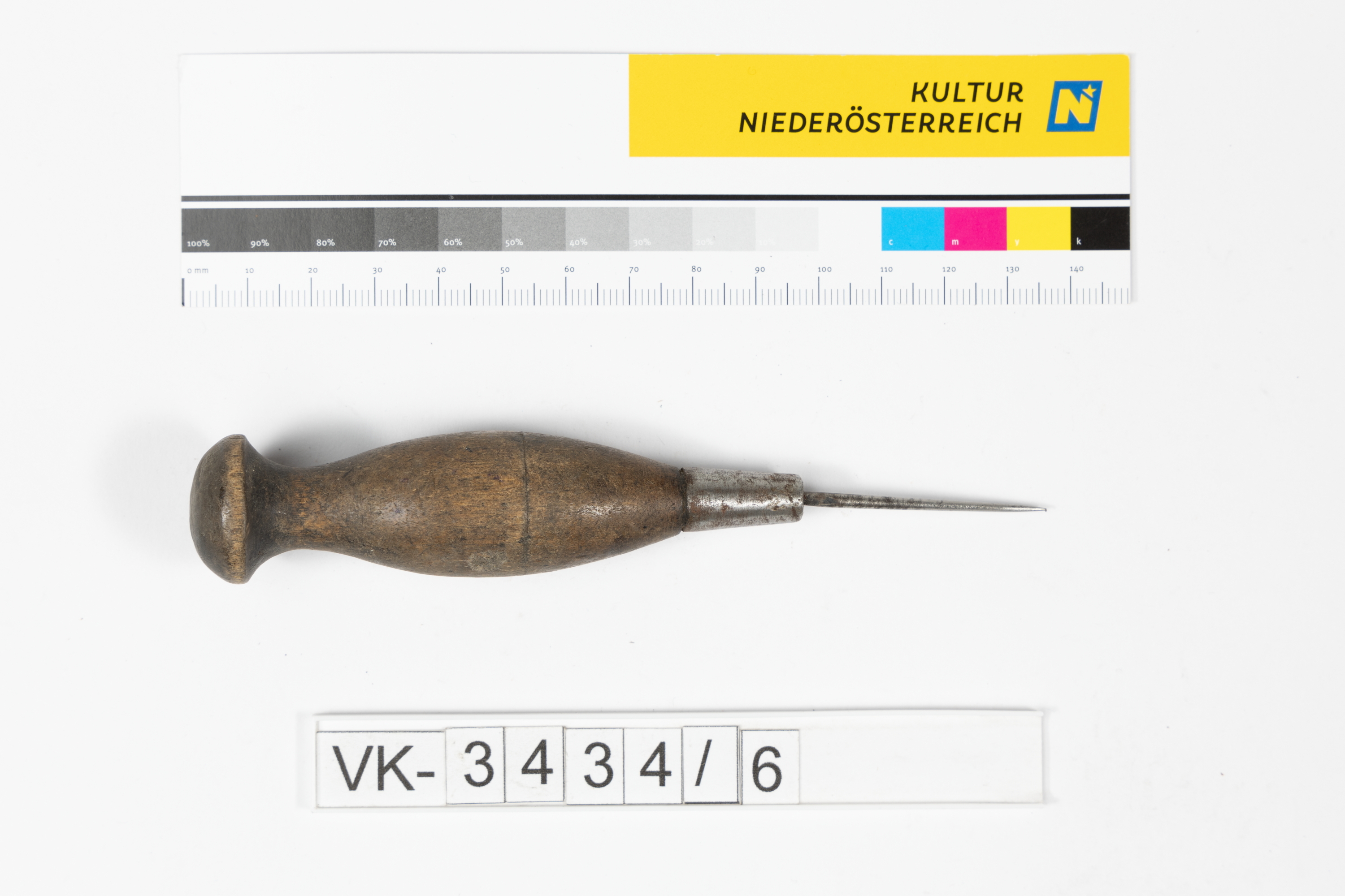Schusterahle mit metallverstärktem, geschwungenem und knaufartig abschließendem, gedrechseltem Holzheft.