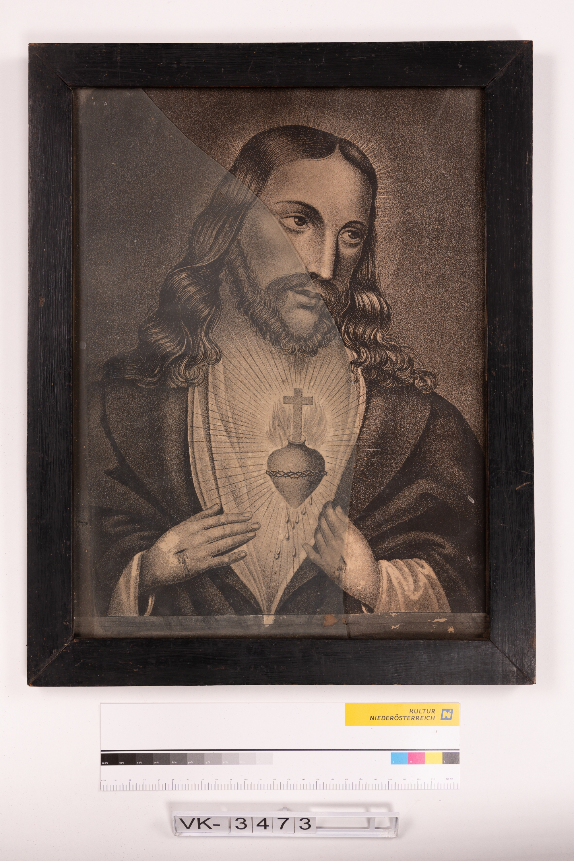 Stich hinter Glas in einem schwarzen Holzrahmen: Herz-Jesu-Darstellung (Christus mit flammendem Herz mit Kreuz und Wundmalen).