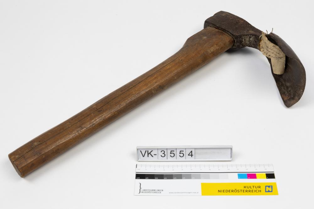 Troghacke mit einem quer stehenden, leicht gewölbten Blatt, das nach unten hin breiter wird. Die Hacke hat einen Holzstiel mit ovalem Querschnitt.