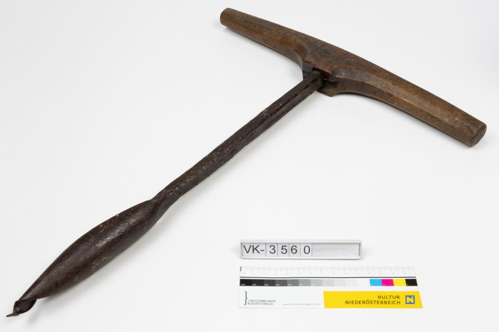 Großer schmiedeeiserner Handbohrer mit einem T-förmig angesetzten Holzgriff.