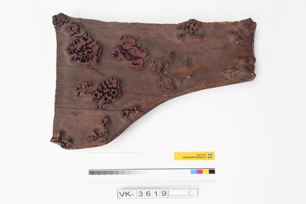 Großes Druckmodel aus Holz mit Metallstiften zum Einpassen. Druckmuster: Unterschiedliche Blumenelemente, mit Resten roter Farbe.