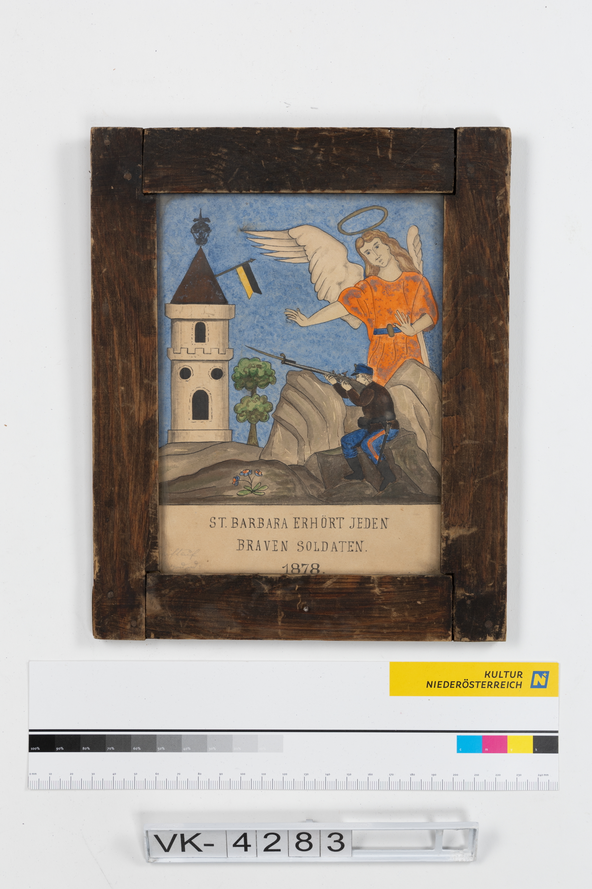 Malerei in einem Holzrahmen mit Glas: Mehrfärbige Darstellung der Hl. Barbara mit einem schießenden Soldaten im Vordergrund. Aufschrift: "ST. BARBARA ERHÖRT JEDEN BRAVEN SOLDATEN".