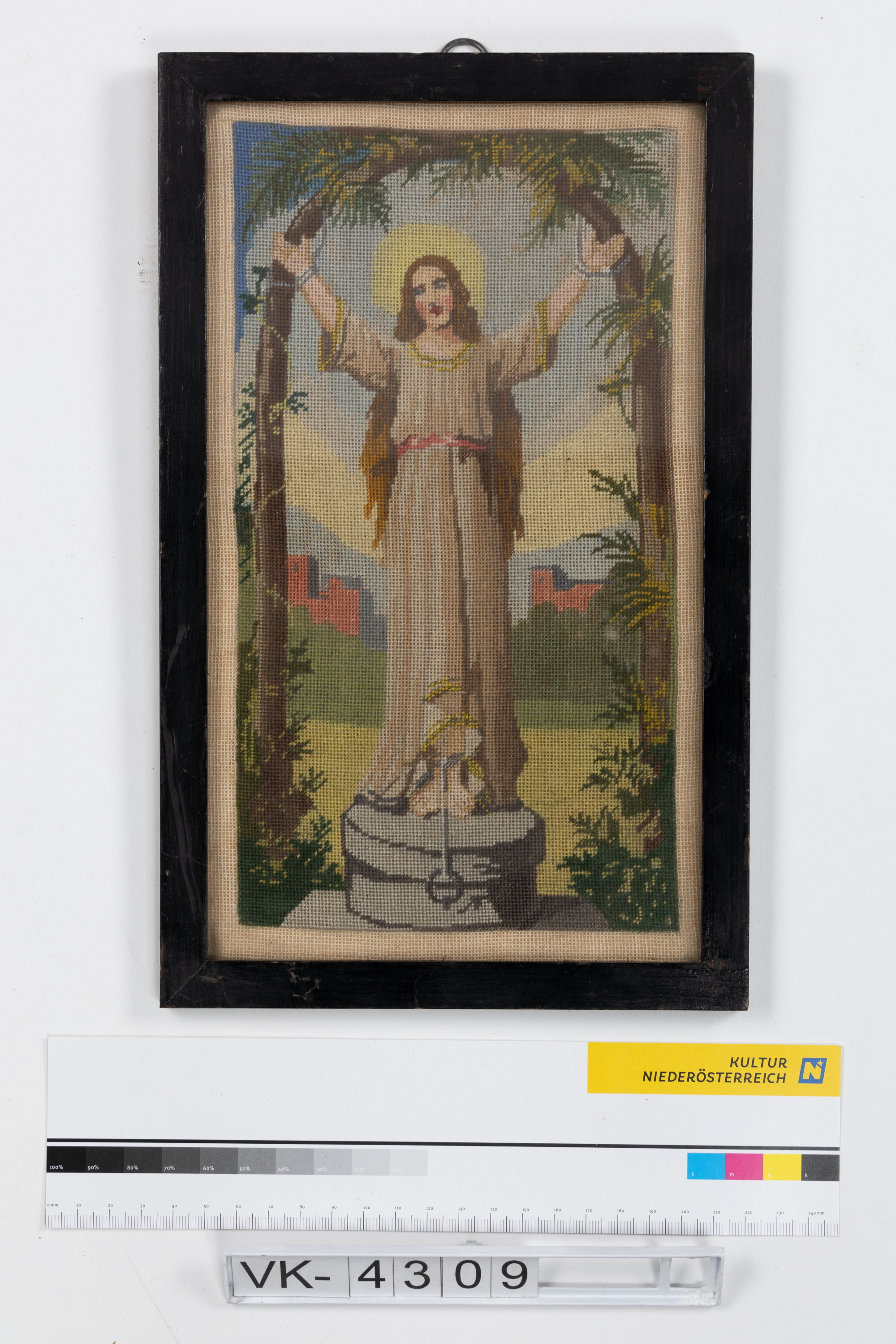 Stickerei in einem braunen Holzrahmen mit Glas: Mehrfärbige Darstellung der Hl. Corona.