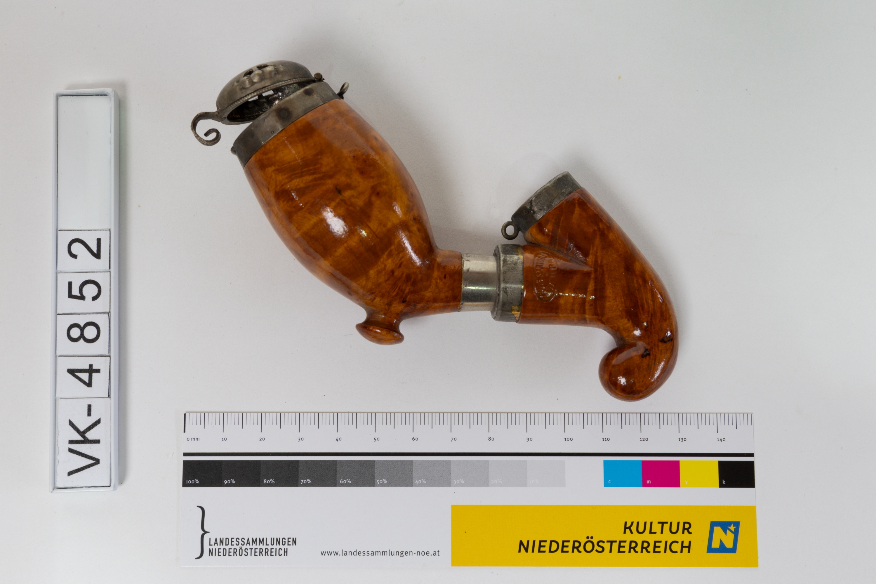 Aus Birkenholz geschnitzter Pfeifenkopf mit Silberdeckel und einem ebenfalls aus Holz geschnitzten Wassersack mit Silberbeschlägen.