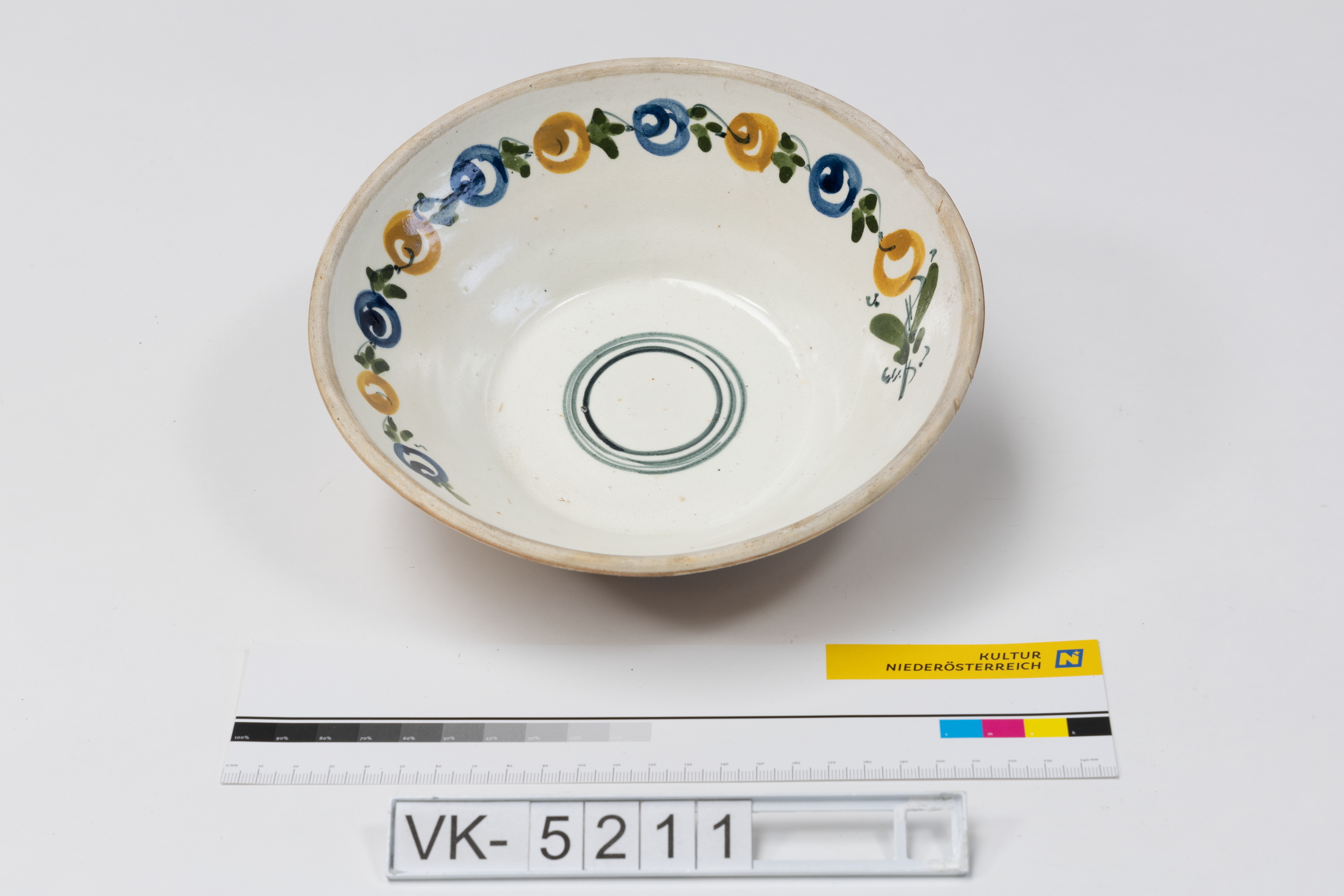 Innen weiß und außen beige glasierte Schüssel mit Liniendekor am Spiegel und beinahe umlaufendem Blatt- und Blütendekor (gelb, blau, grün) an der Wandung.