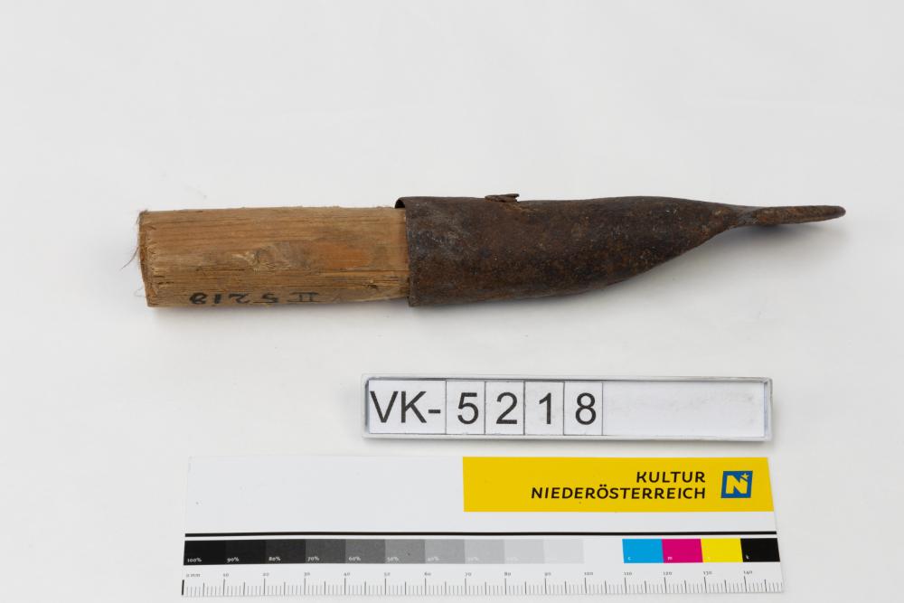 Schmiedeeiserner Pflanzenstecher mit kurzen Holzstiel.