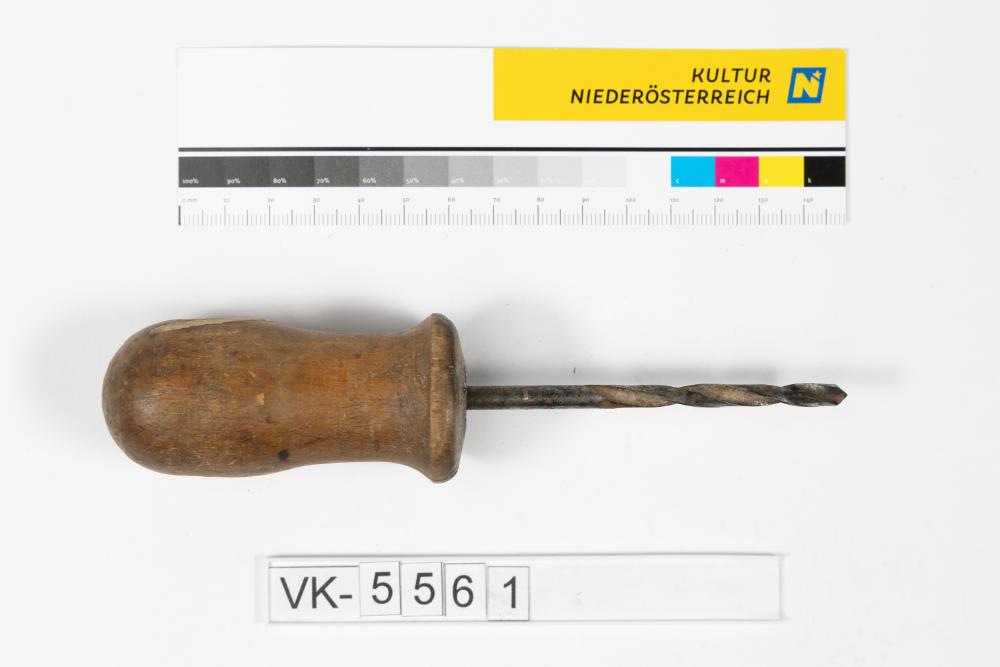 Spiralbohrer mit einem kurzen, knaufartigen Holzgriff.