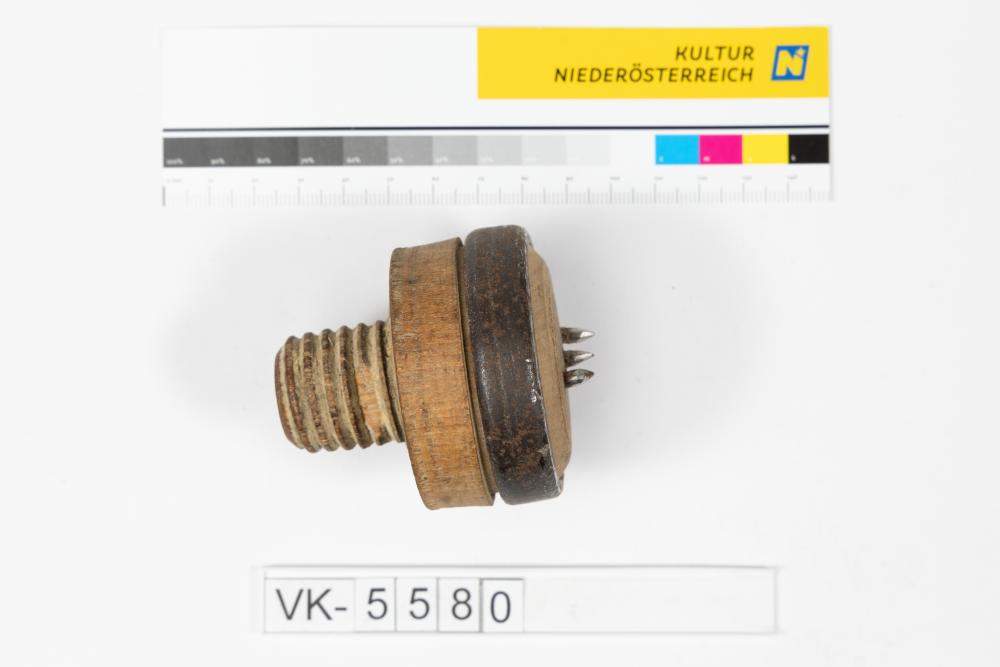 Bohr- bzw. Fräswerkzeug mit drei kurzen Spitzen in einem zylindrischen, hölzernen Gewindeaufsatz, der mit einem Eisenring verstärkt ist.