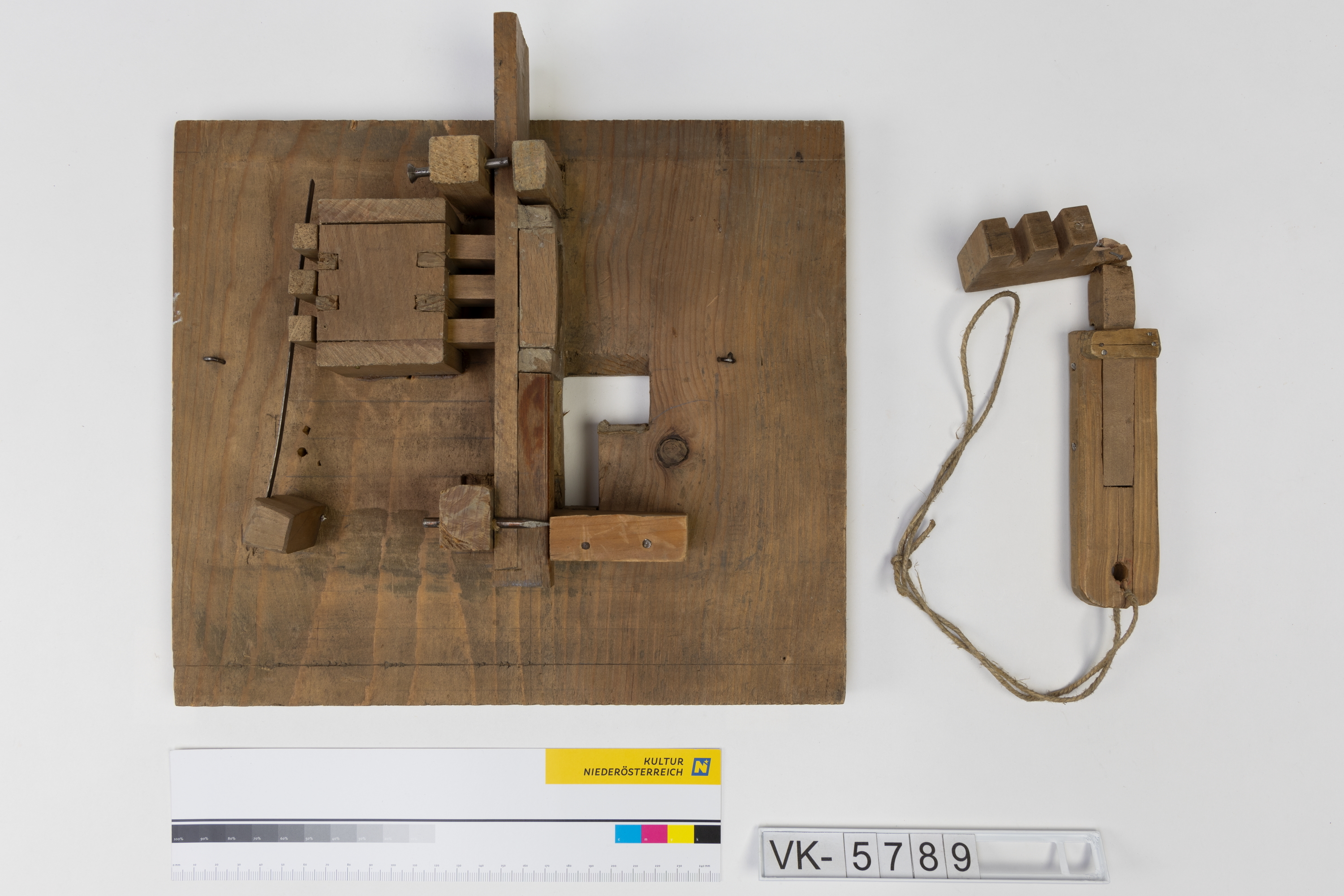 Großes Holzmodell eines Fallriegelschlosses mit eingestecktem Schlüssel zur Demonstration der Funktion.