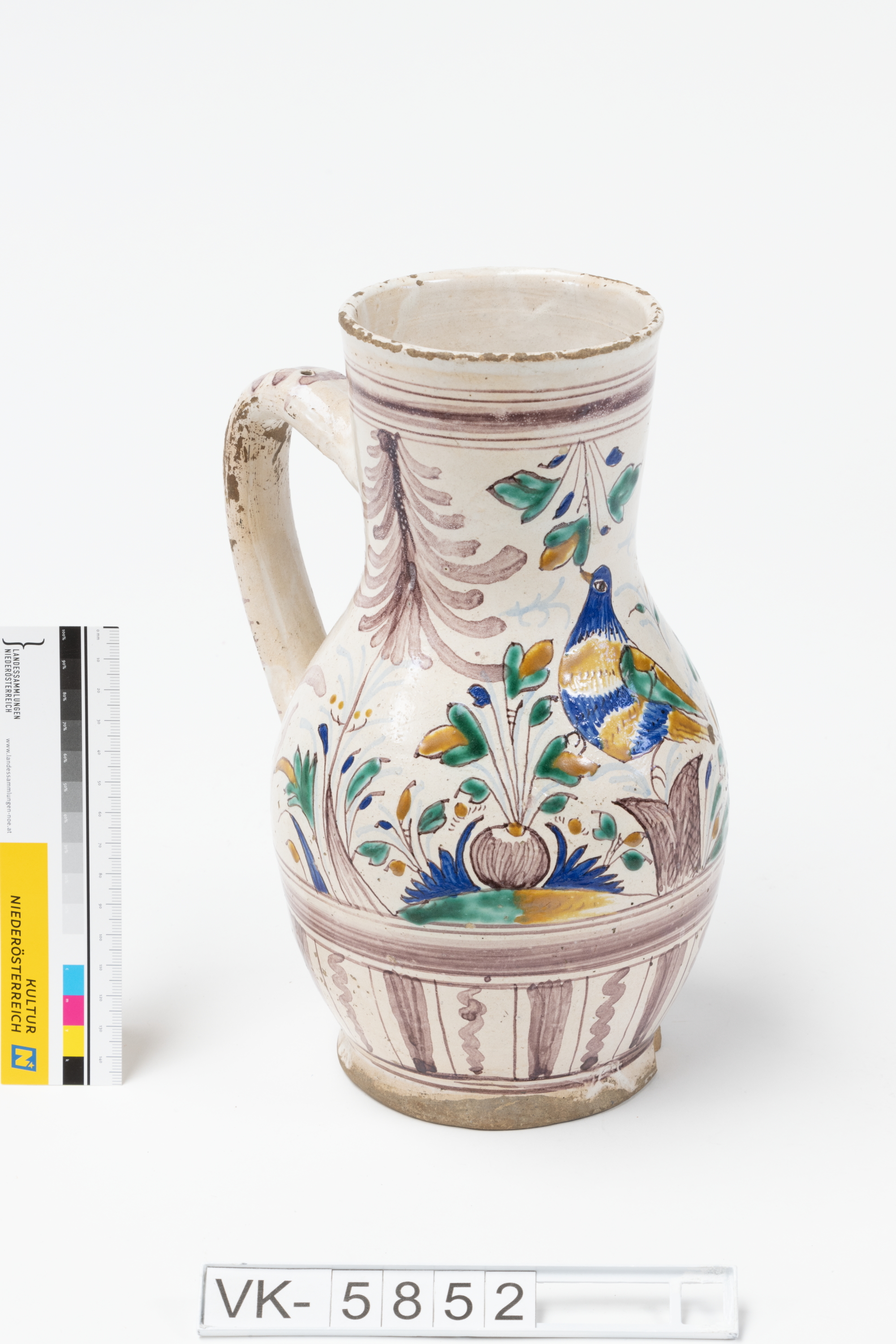 Bauchiger Majolika-Krug mit unterrandständigem Bandhenkel und mehrfärbiger Bemalung: Florale Motive und ein bunt gefiederter Vogel.