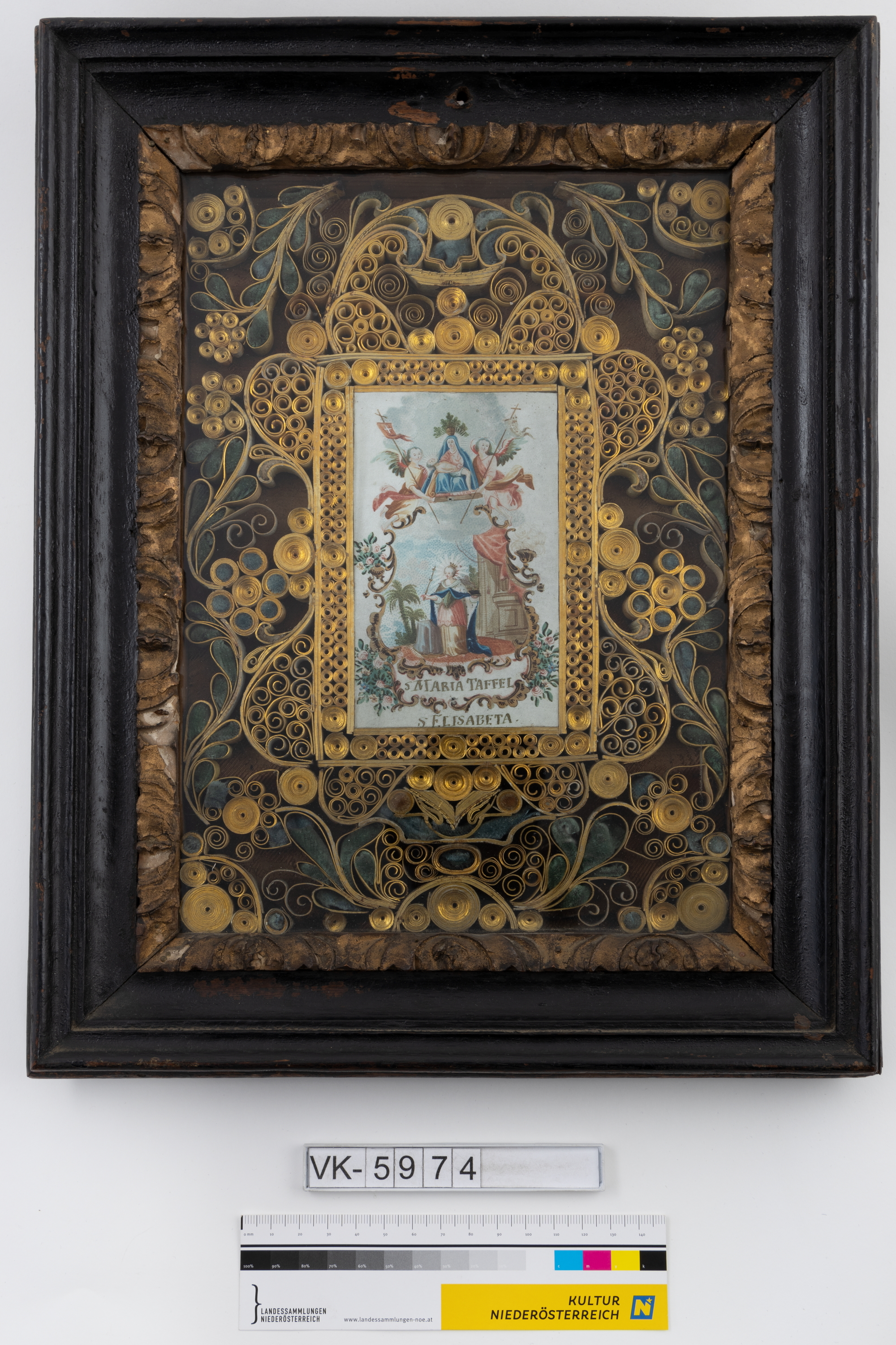 Votivbild (Klosterarbeit) in einem Holzrahmen hinter Glas: Ein mehrfärbiges Bildchen mit der Darstellung der Hl. Elisabeth, darüber die Wallfahrtsmadonna Maria Taferl, umgeben von aus Holz gebogenen Ornamenten und Blüten.