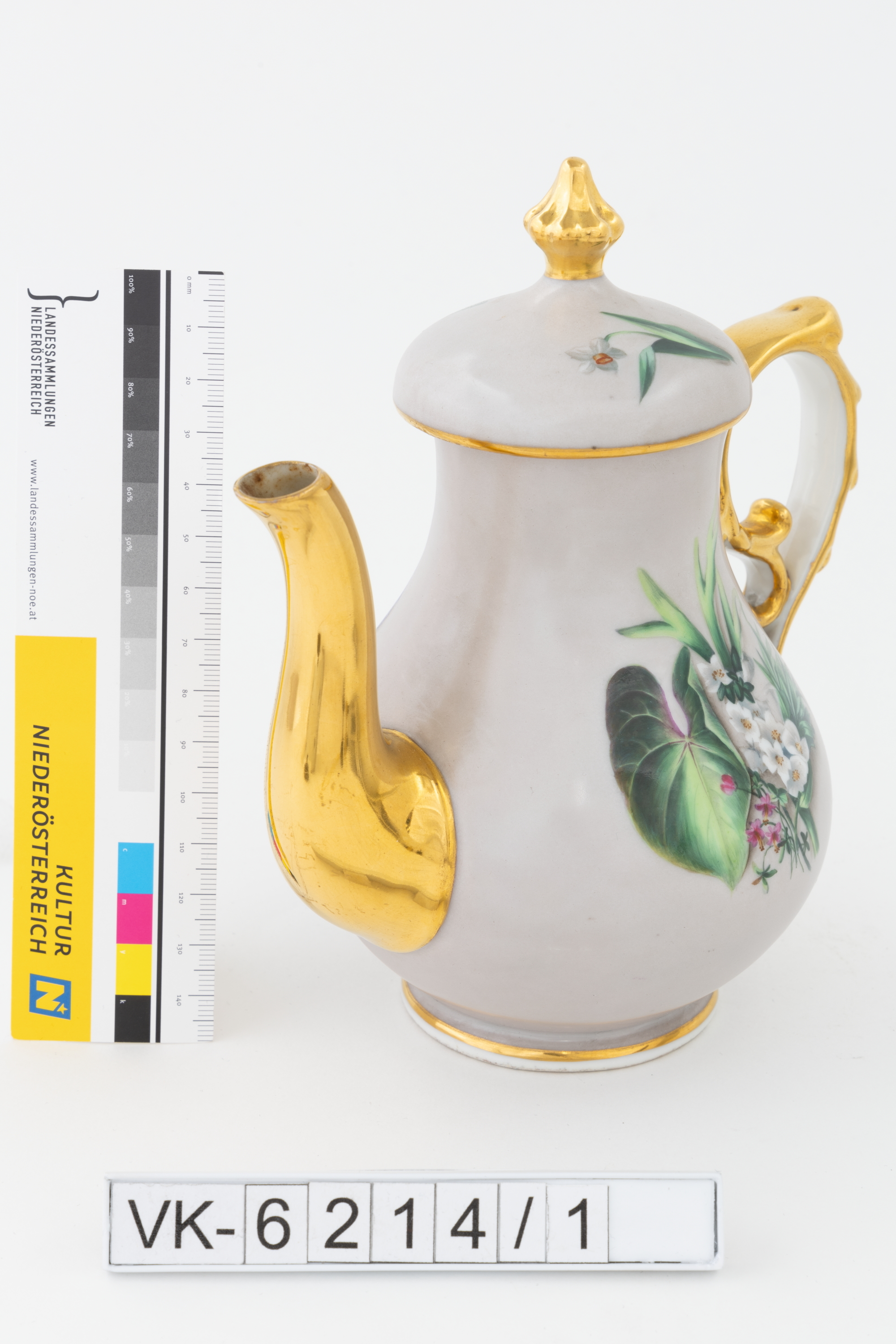Kaffeekanne (VK-6214/1a) mit ornamental verzierten und vergoldeten Henkel, vergoldeter Tülle und einem Deckel (VK-6214/1b) mit vergoldetem Knauf. Auf Kanne und Deckel sind vier unterschiedliche naturalistische Blumendarstellungen aufgemalt (Narzisse, Vergissmeinnicht, blaue Pfingstrose und weiße Blüten).