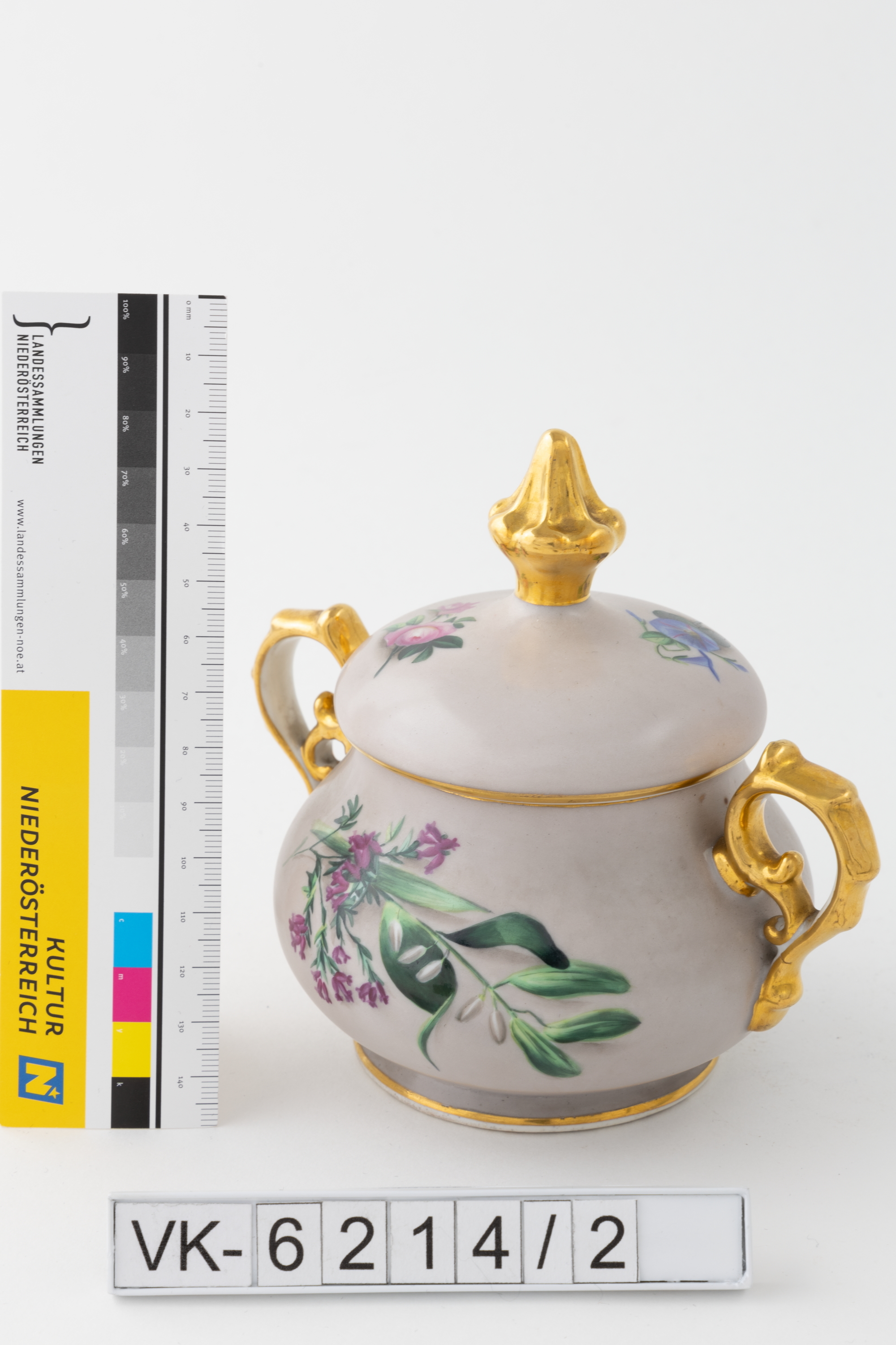 Zuckerdose (VK-6214/2a) mit ornamental verzierten und vergoldeten Henkeln und einem Deckel (VK-6214/2b) mit vergoldetem Knauf. Auf Dose und Deckel sind vier unterschiedliche naturalistische Blumendarstellungen aufgemalt (Rosen, Windling und rosa Blüten).