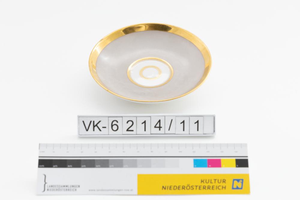 Untertasse mit goldenen Ringen am Spiegel und einem breiten Goldrand.