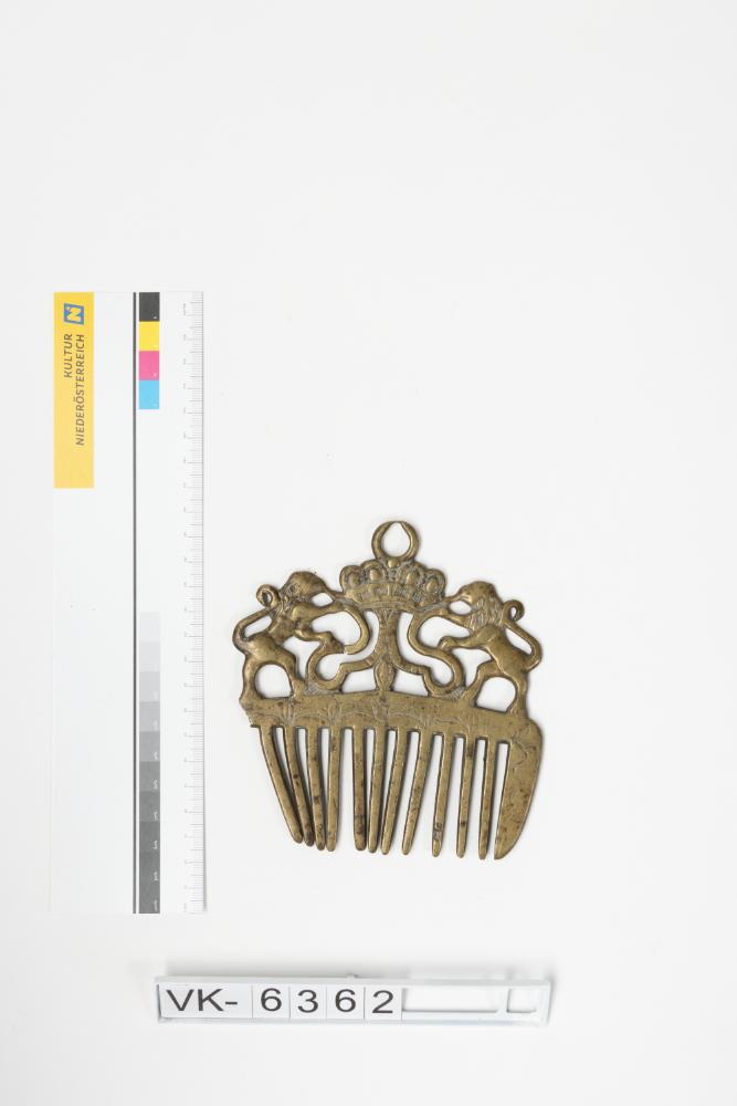Kummetkamm mit einer Öse, einer Krone und zwei Löwen.