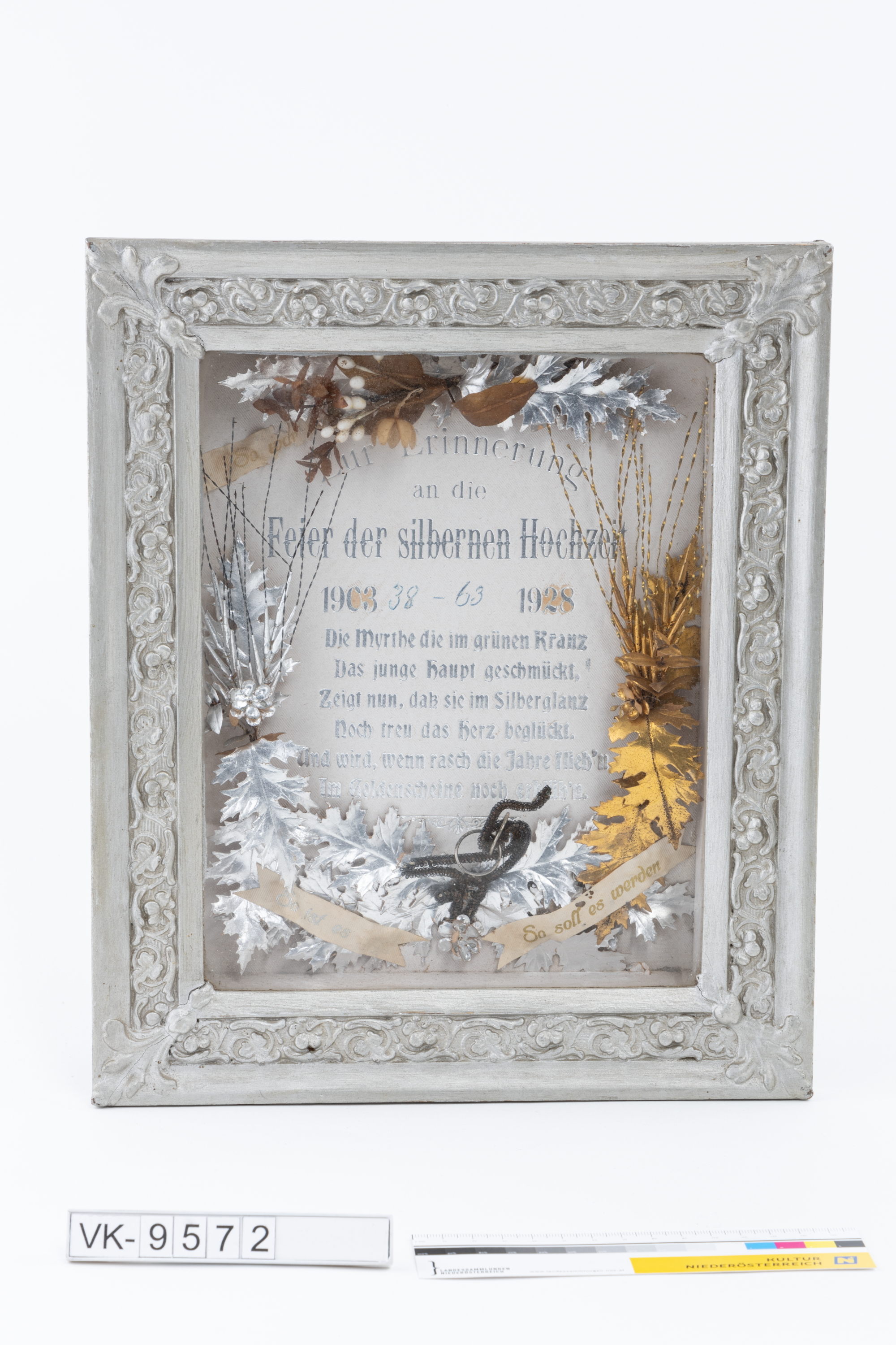 Kastenbild zum Jubiläum der Silbernen Hochzeit mit Jahresdaten und einem Gedicht in einem silbernen Rahmen.