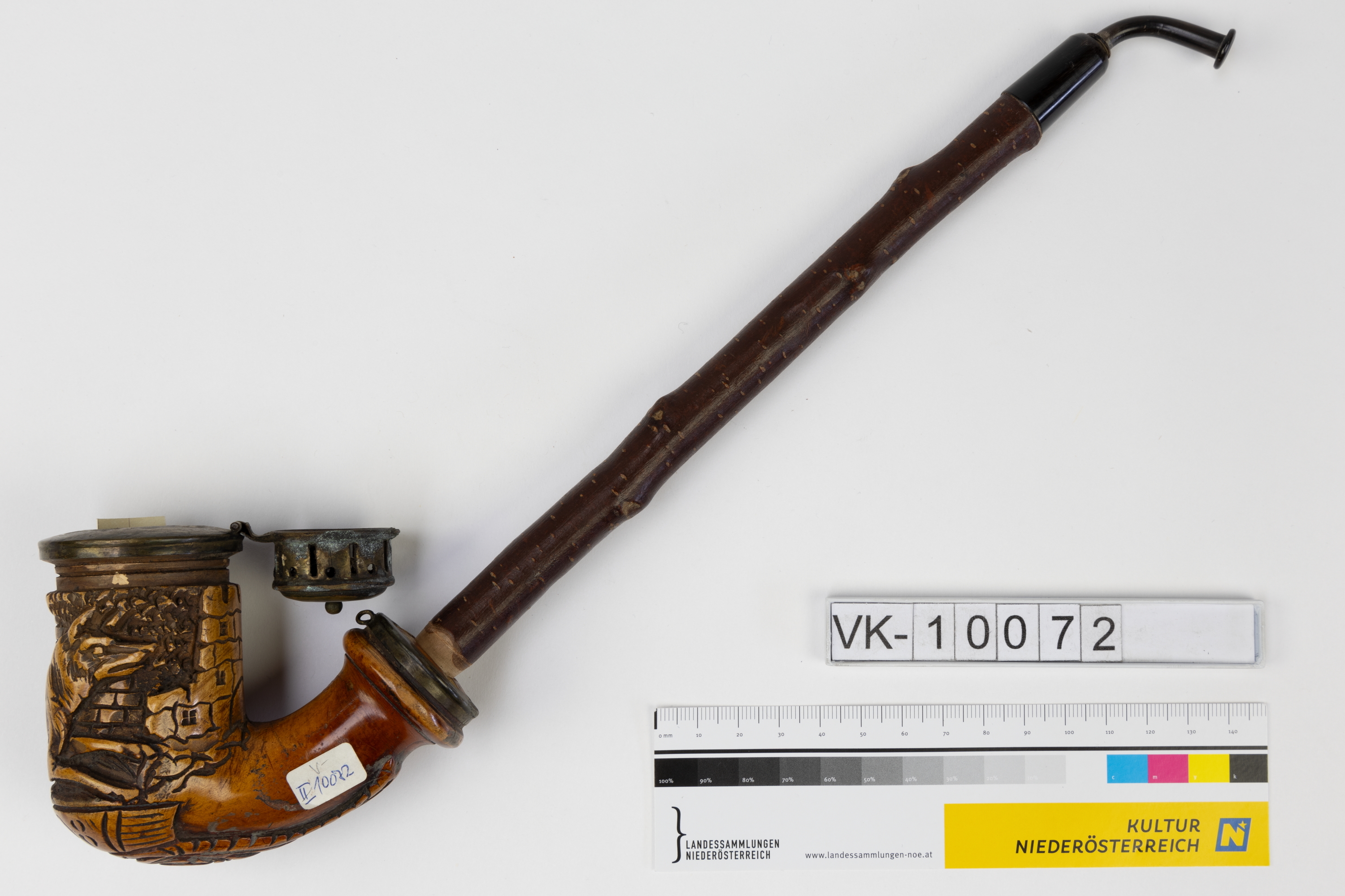 Gesteckpfeife mit hölzernem, großflächig beschnitztem Kopf (Wolf, Turm mit Torbogen, "1798"), Kirschholzrohr mit Metallmundstück und einem umlaufend durchbrochenen Messingdeckel.
