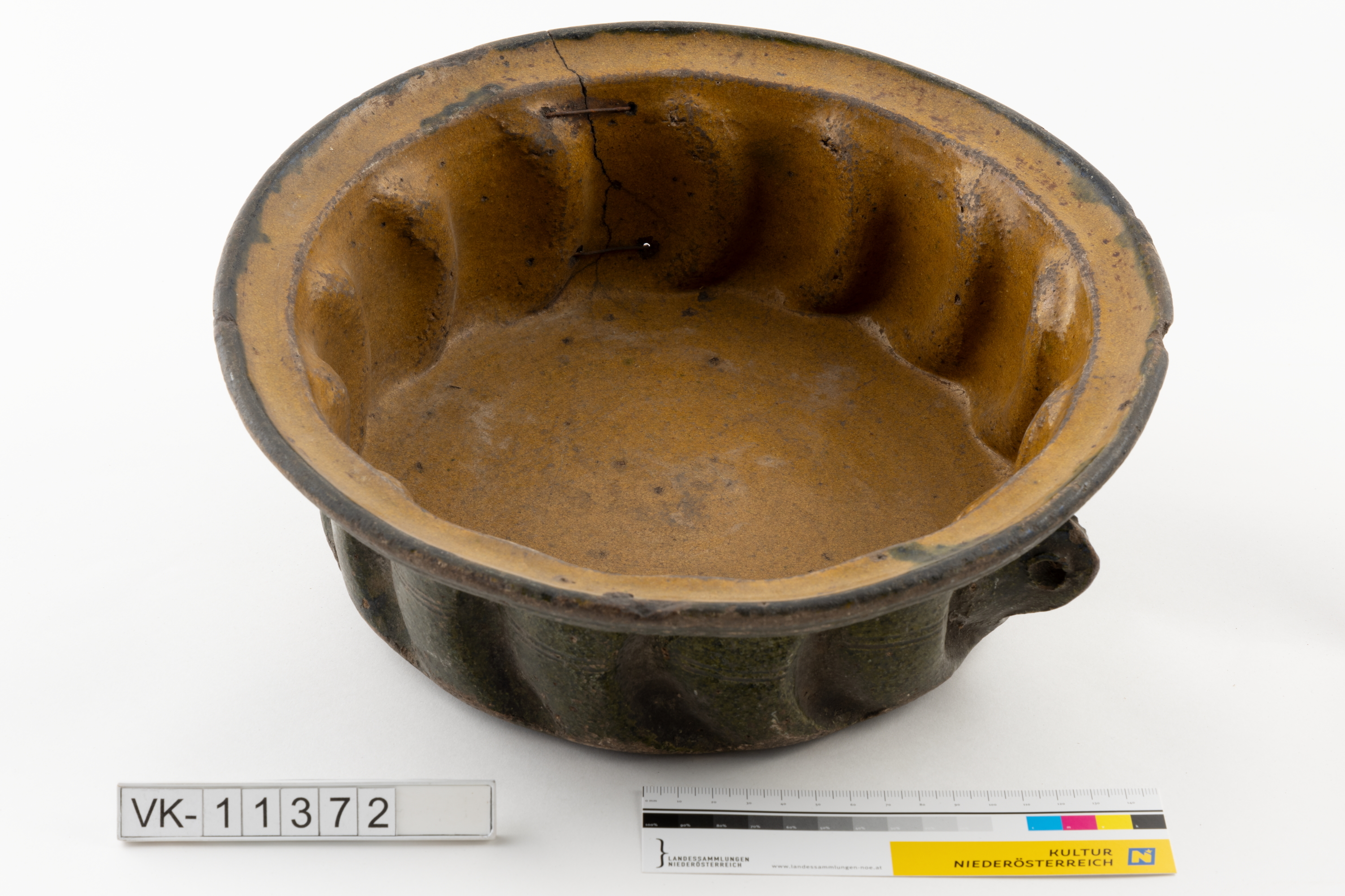 Innen braun und außen grün glasierte Kuchenform mit flachem Boden und umlaufend vertikalen Rillen; an der Seite befindet sich eine angeformte Öse.