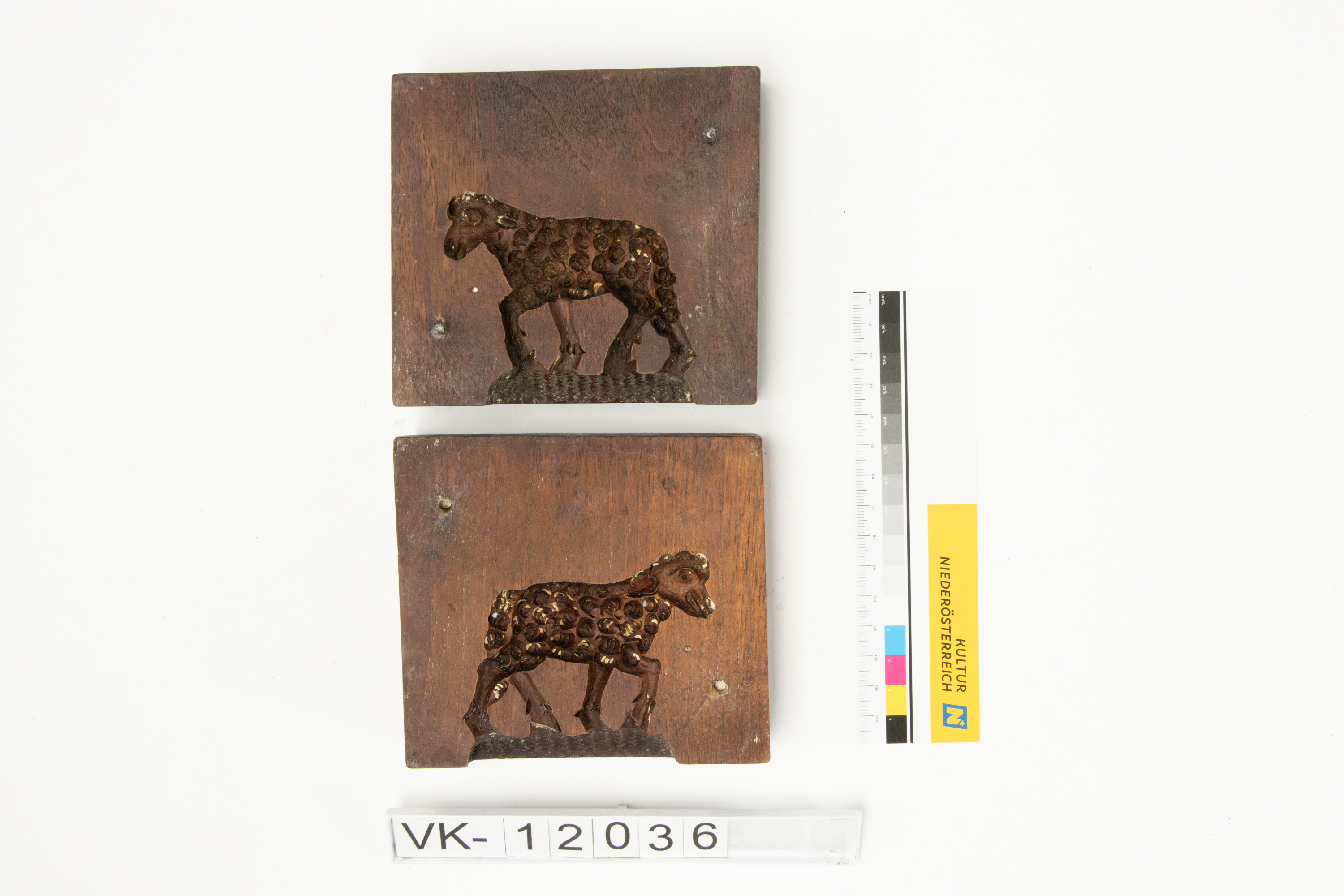 Zwei Hälften eines Lebzeltermodels mit Führungen und jeweils einem eingeschnitzten Motiv: Ein Lamm.