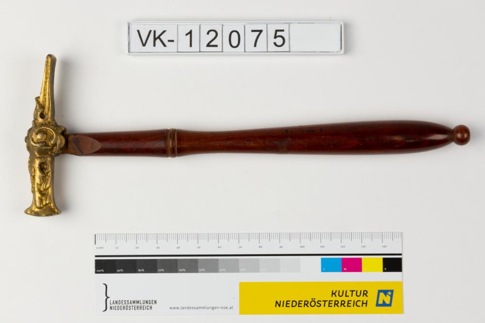Aus Messing gegossener Hammerkopf mit ornamental verzierter Oberflächer, annähernd runder Bahn und schmaler Finne; in dem Kopf steckt ein gedrechselter Holzstil, der dunkelrot gebeizt ist und nicht zu dem Hammerkopf gehört.