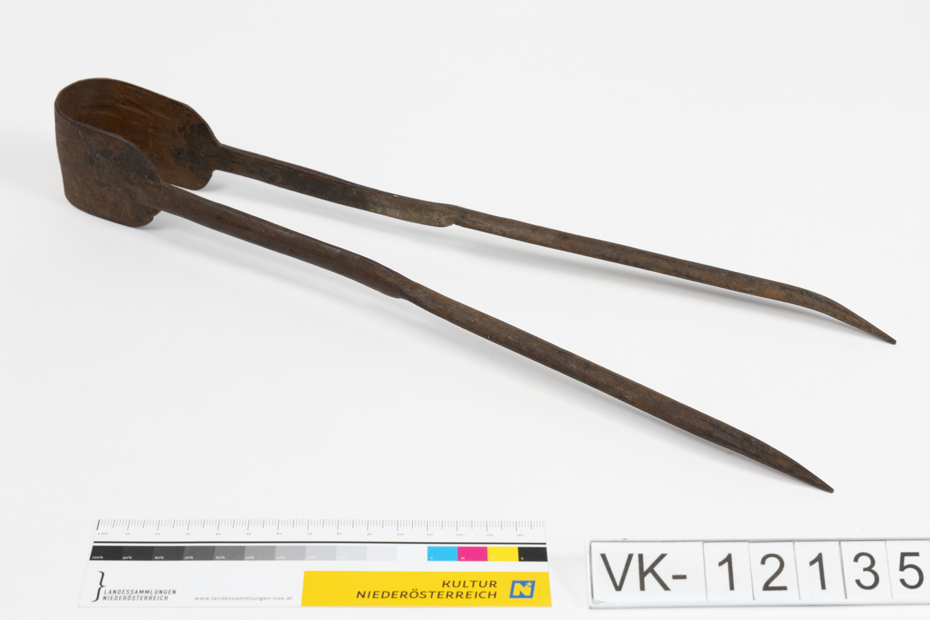 Schmiedeeiserne Ofenzange mit runden, zugespitzten Backen.