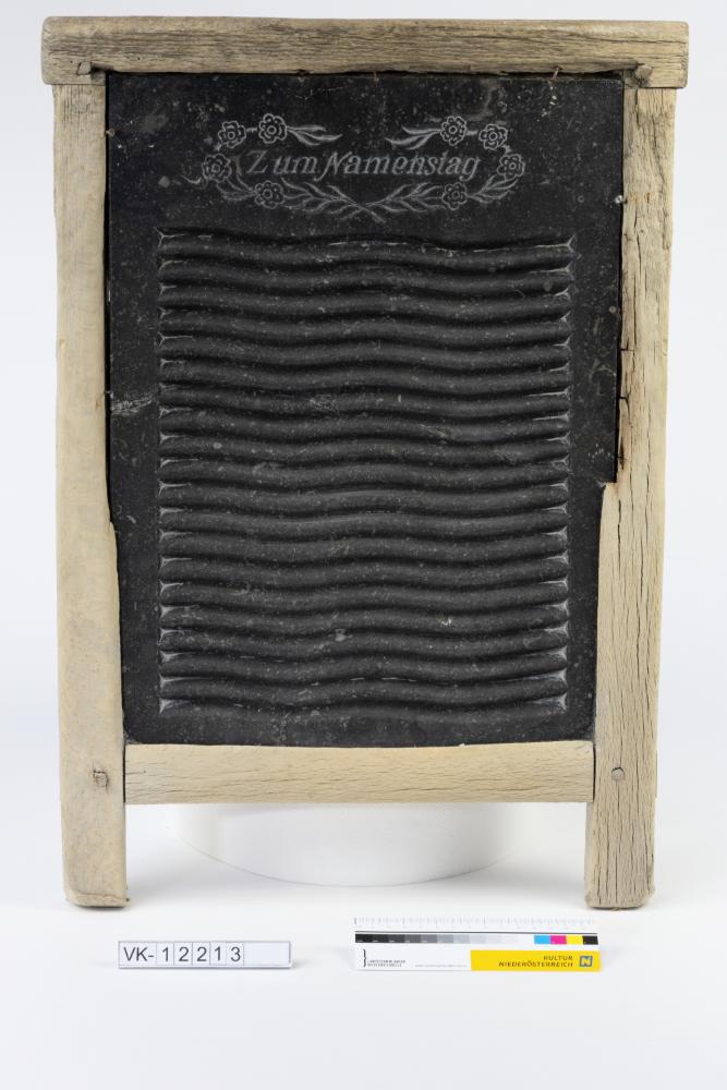 Waschrumpel aus schwarzem Stein in einem Holzrahmen. Die Steinplatte ist mit einer Gravur versehen: Florales Motiv, "Zum Namenstag".