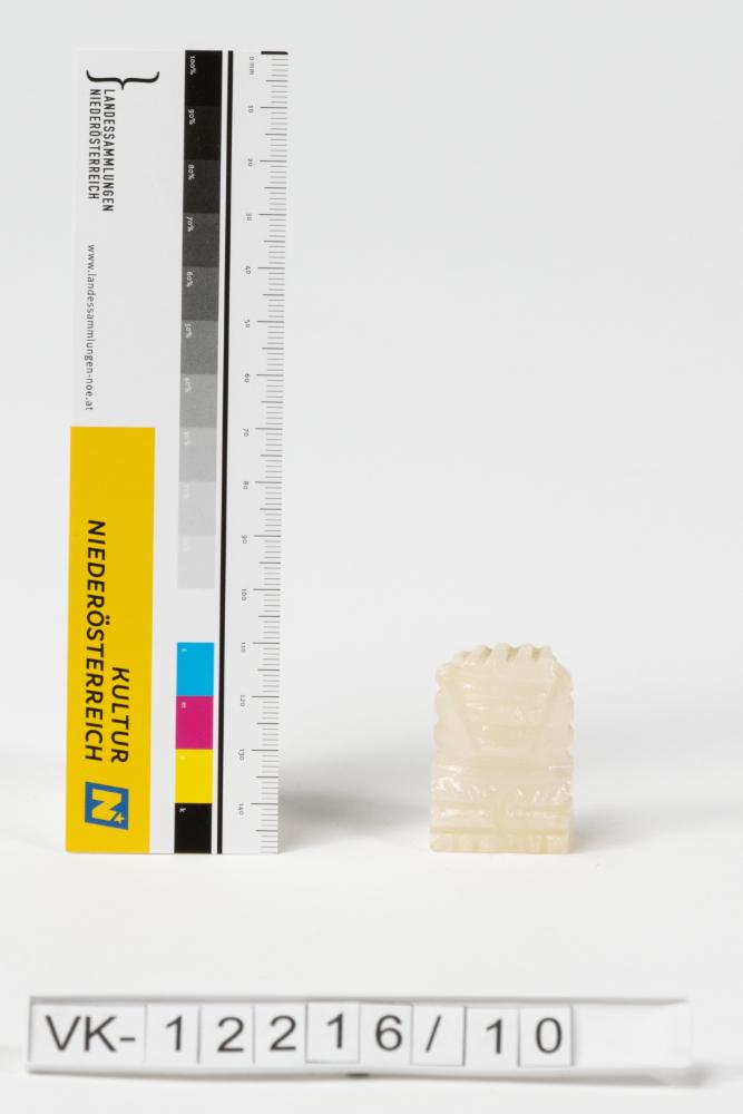 Schachfigur: Bauer, weiß. Die Figur ist im Stil aztekischer Kunst gestaltet.