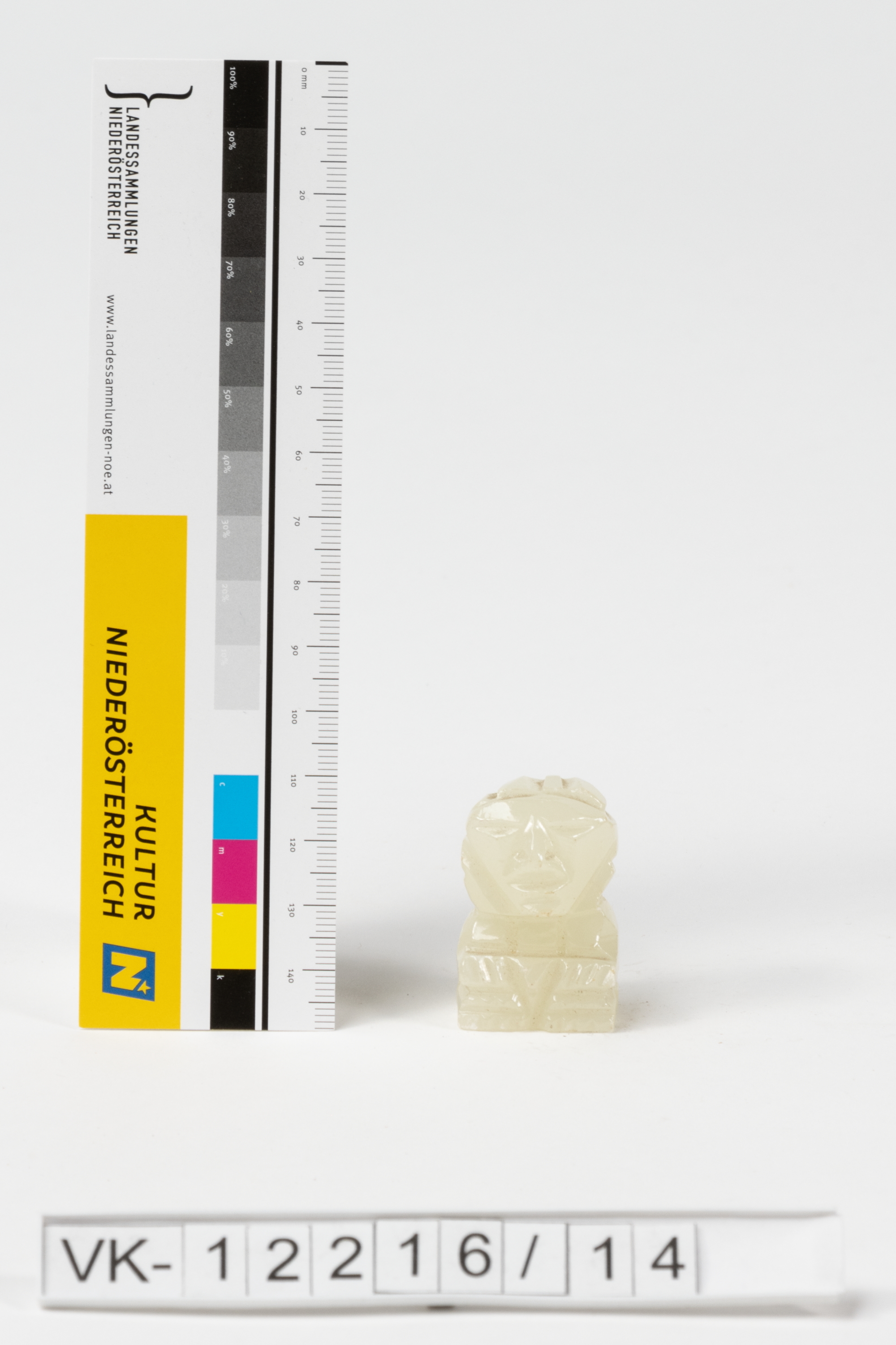 Schachfigur: Bauer, weiß. Die Figur ist im Stil aztekischer Kunst gestaltet.