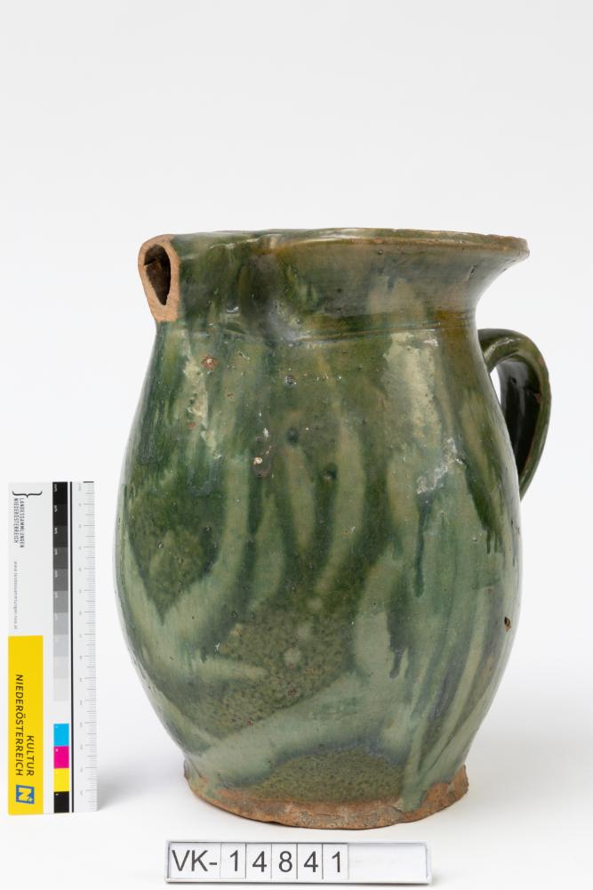 Leicht bauchiger, außen grün und innen hellbraun glasierter Krug mit schulterständigem Bandhenkel, abgebrochener Tülle und teilweise abgedeckter Öffnung.