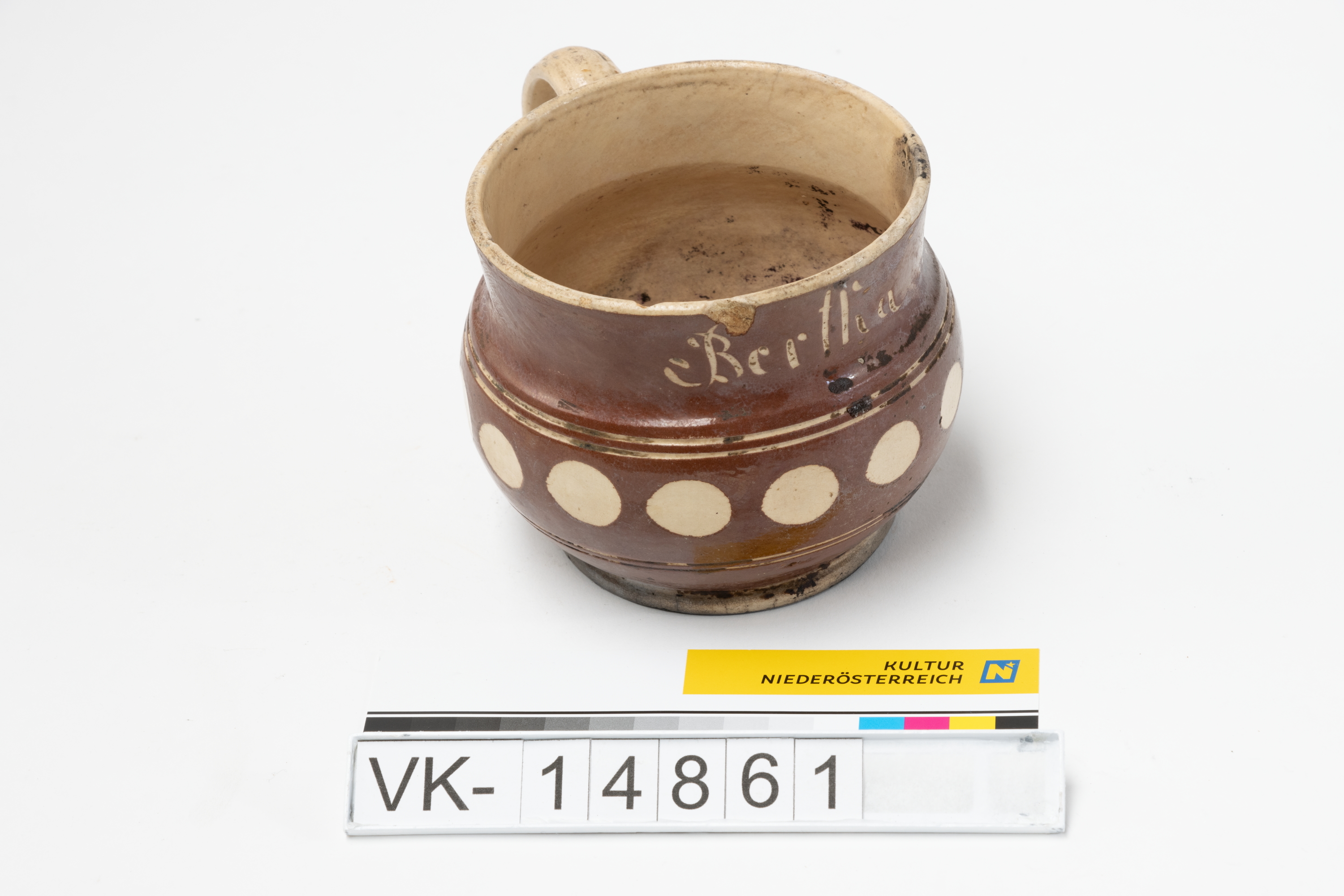 Innen beige und außen rotbraun (mit weißen Punkten) glasiertes Häferl mit einem beigen unterrandständigen Bandhenkel und einer Aufschrift: "Bertha".