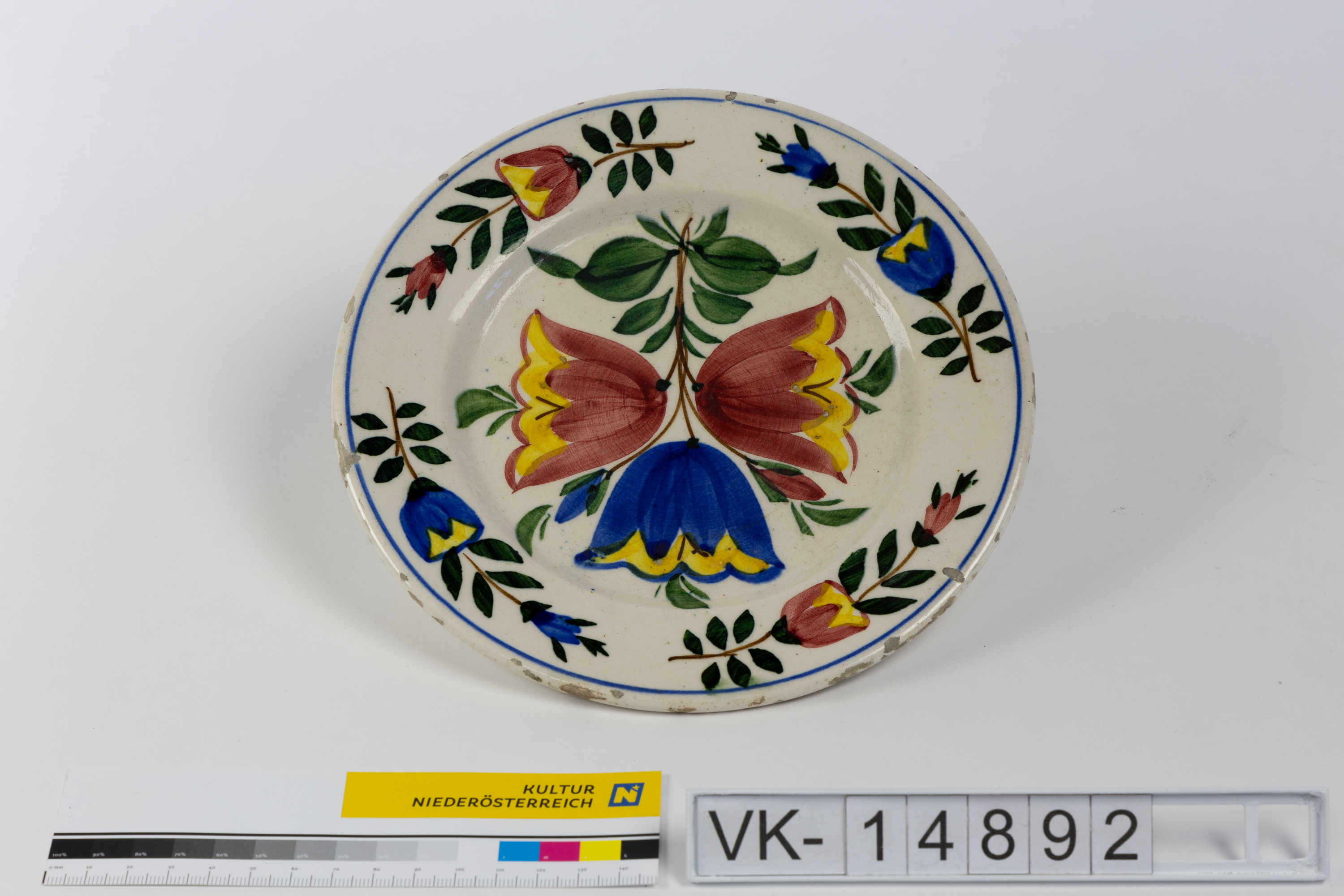 Kleiner, weiß glasierter Teller mit mehrfärbiger Bemalung: Rote und blaue Blüten samt Blattwerk am Spiegel und auf der Fahne.