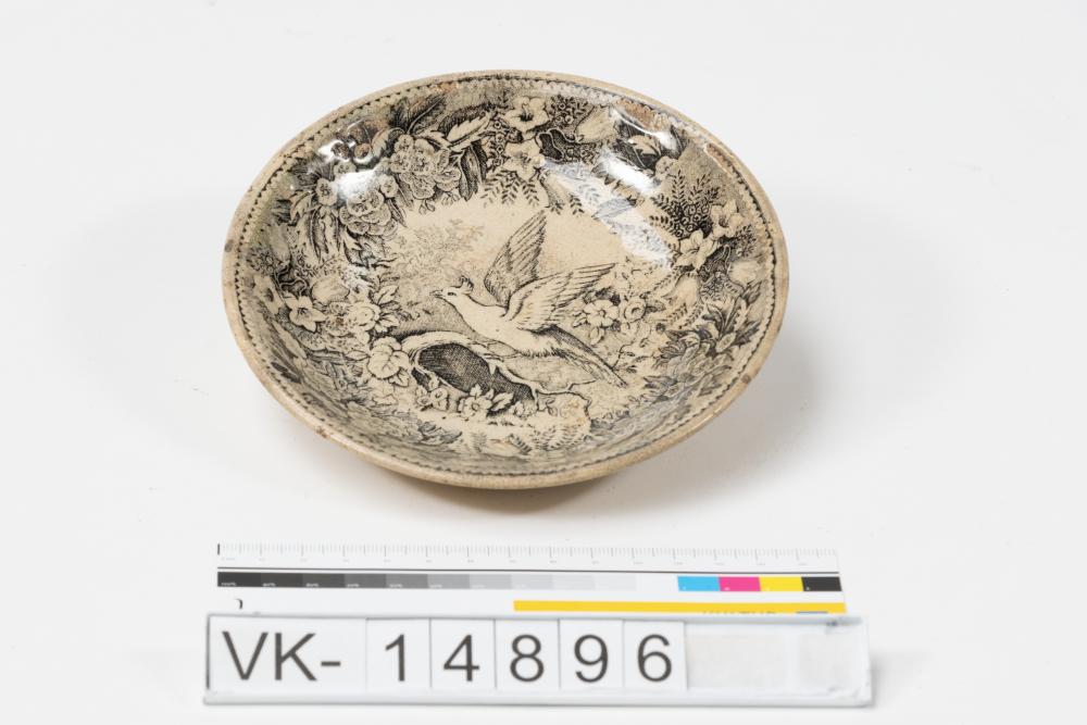 Teller mit großflächiger Darstellung: Umlaufend Blüten und Blattwerk, in der Mitte ein Vogel auf einem Ast (Auerhahn). Auf der Unterseite befindet sich am Boden eine Prägung: "ZNAIM".
