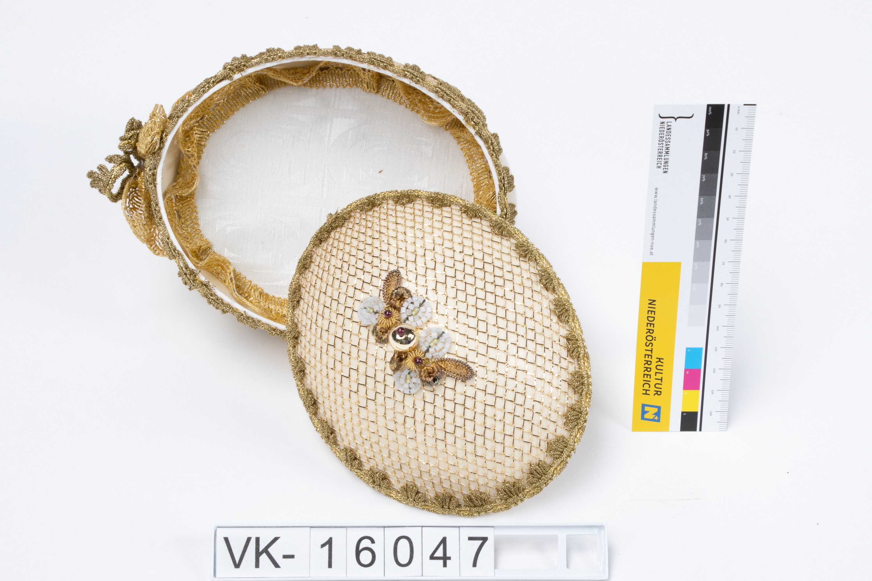 Zierschatulle (VK-16047a) mit Deckel (VK-16047b) aus einem Straußenei (Klosterarbeit); die Schatulle und der Deckel bestehen aus einem aufgeschnittenen, quer gestellten Straußenei. Die Außenflächen sind mit goldenen Borten, goldenem Netz und Zierperlen in verschiedenen Farben besetzt; die Schatulle steht auf vier Füßen aus goldenen Kunststoffperlen.