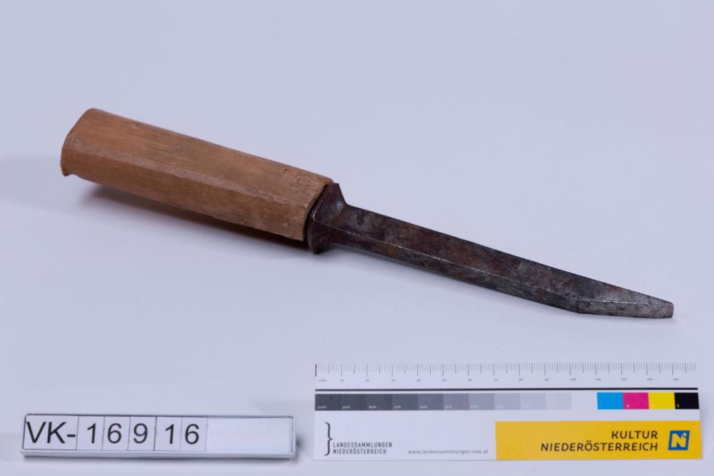 Meißel mit annähernd quadratischem Querschnitt und zur Hälfte abgebrochenem Holzgriff. Auf dem Meißel befindet sich die Prägung: "GARANTIERT GUSSSTRAHL".