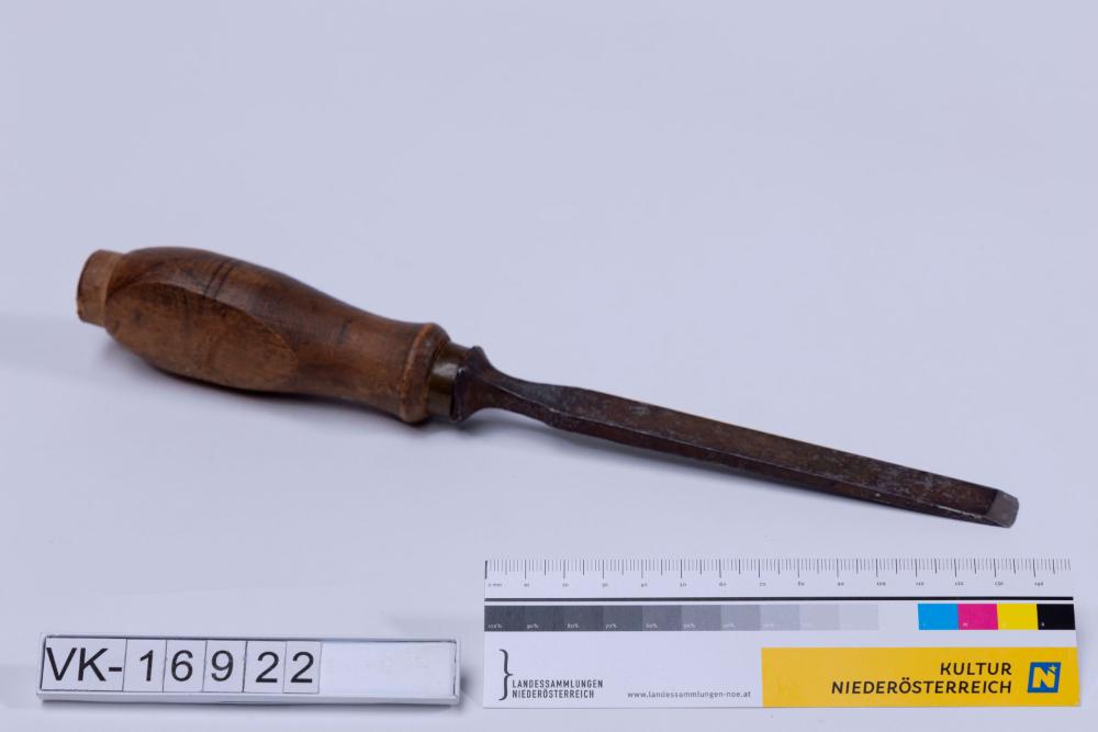 Flacher Meißel mit Verjüngung am Übergang zum Griff und einem gedrechselten Holzgriff mit einem Metallring und einer Abflachung, in deren Bereich ein Buchstabe eingezeichnet ist.