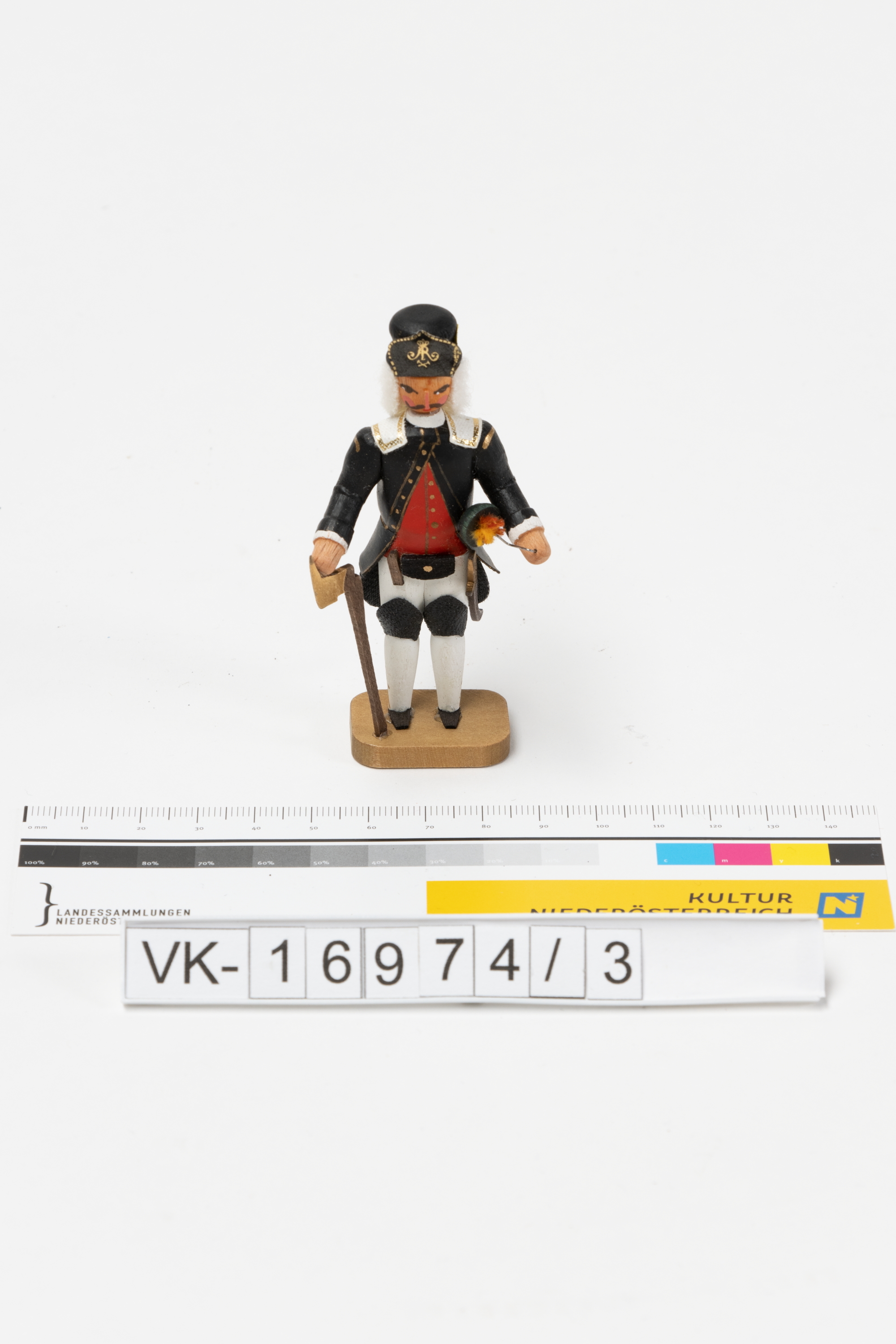Kleine Holzfigur: Mann mit schwarz-weißer Uniform, schwarzer Kappe, Hacke und Säbel. Auf dem Sockel befindet sich unten ein Aufkleber: Darstellung eines Wappens (Marke) mit "WW" und der Aufschrift: "2 Bergmeister um 1719 entw. 1982".