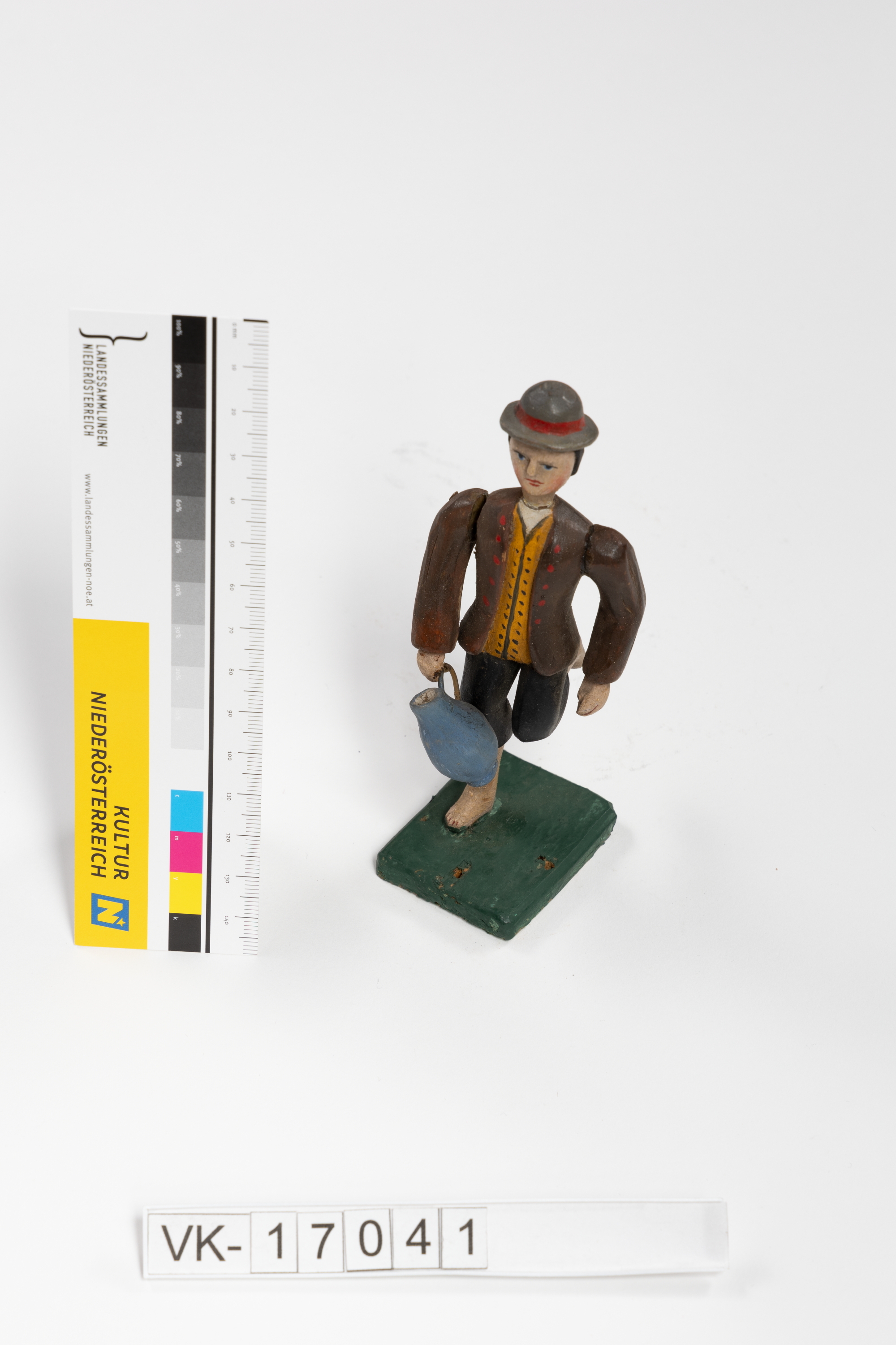 Hölzerne Krippenfigur auf einem Sockel: Gehender Mann mit brauner Jacke, schwarzer Hose und grauem Hut, einen blauen Krug tragend. Die Arme der Figur sind beweglich.