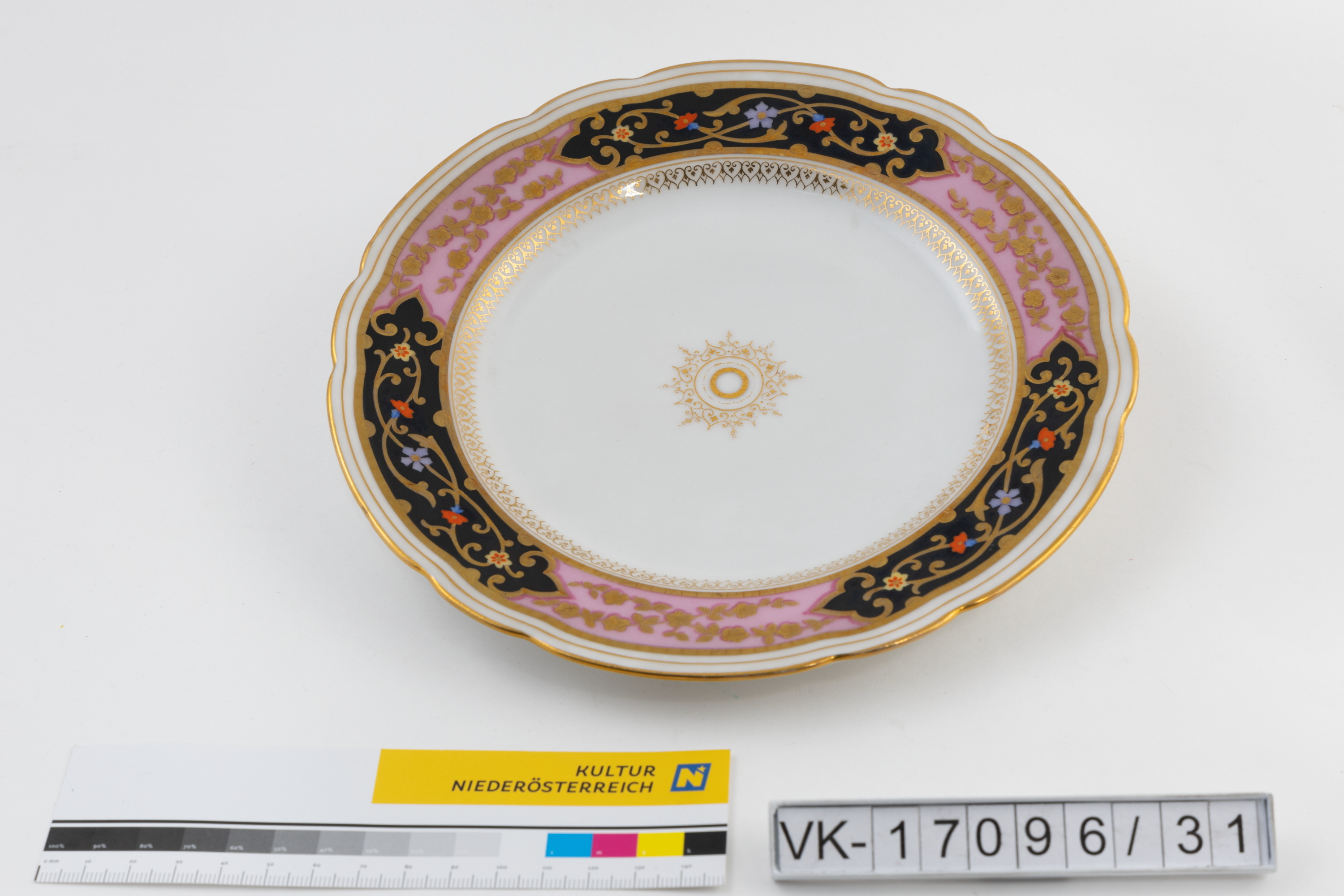 Desserteller mit leicht gewelltem Rand und Dekor: Goldlinien, vergoldeter Rand und ein umlaufendes Dekorband (je drei schwarz und rosa hinterlegte Elemente, die mit goldenen Ranken und mehrfärbigen Blütendarstellungen verziert sind) auf der Fahne. Am Boden sind konzentrische Kreise im Porzellan zu sehen.