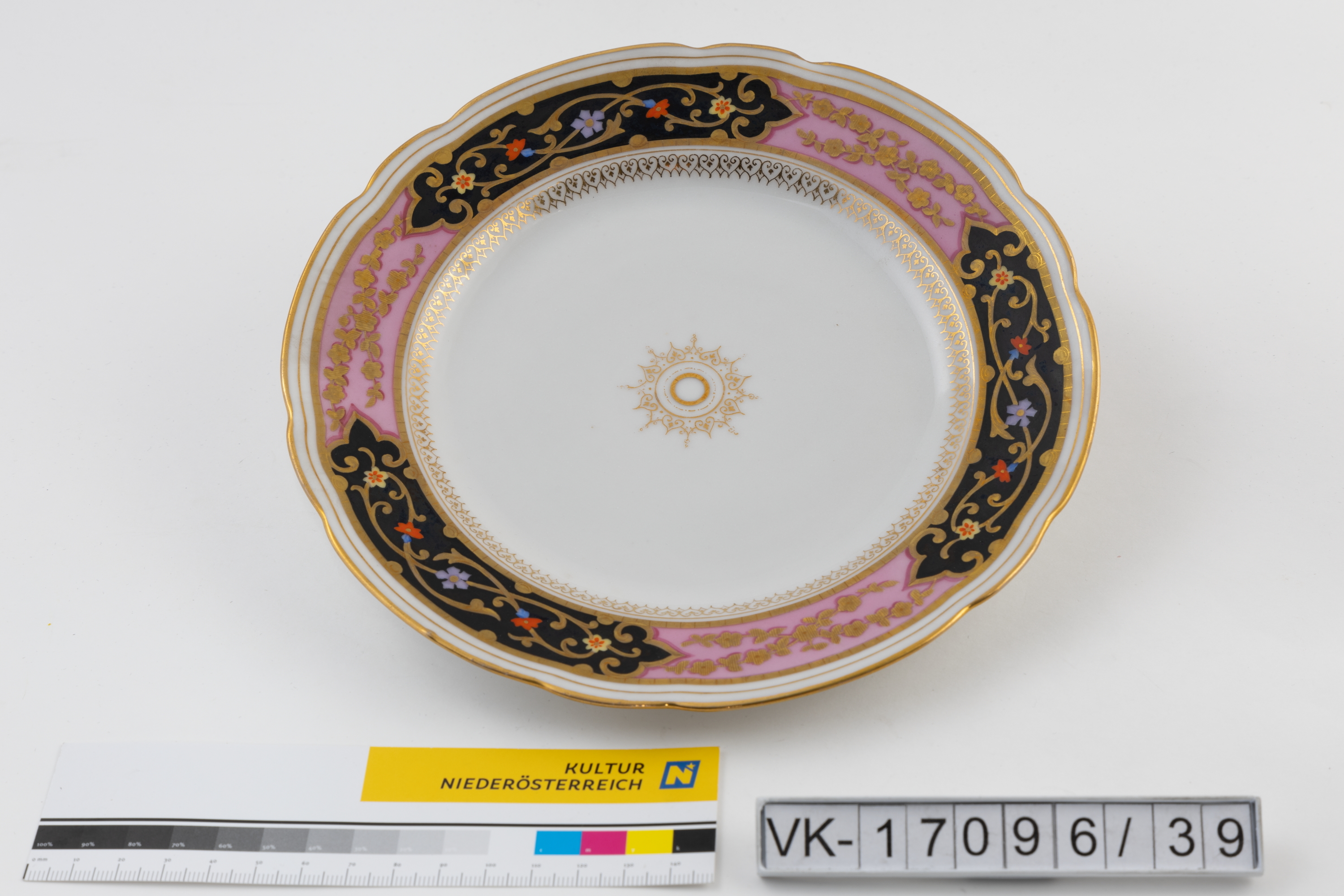 Desserteller mit leicht gewelltem Rand und Dekor: Goldlinien, vergoldeter Rand und ein umlaufendes Dekorband (je drei schwarz und rosa hinterlegte Elemente, die mit goldenen Ranken und mehrfärbigen Blütendarstellungen verziert sind) auf der Fahne. Am Boden sind konzentrische Kreise im Porzellan zu sehen.