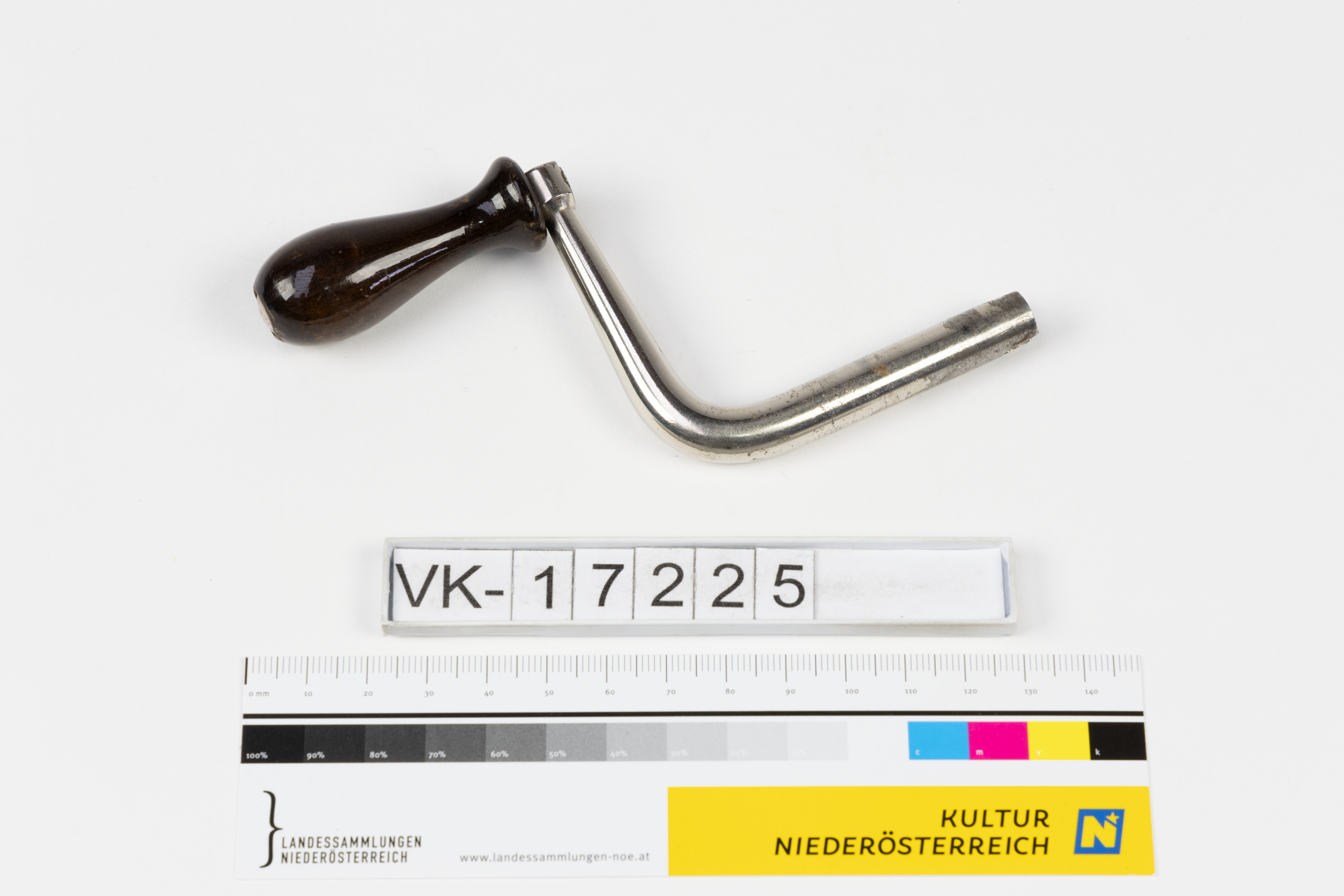 Metallkurbel mit Holzgriff für einen Plattenspieler.